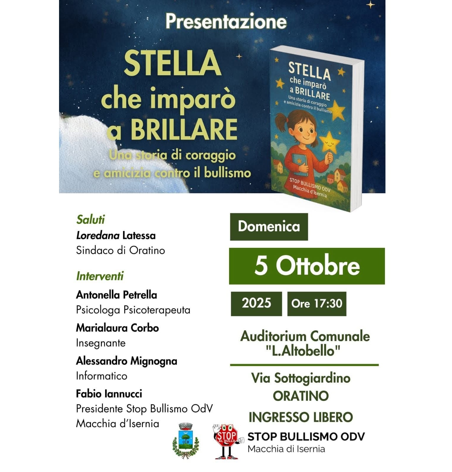 Un evento dedicato alla presentazione del libro scritto per i bambini, che affronta il tema del bullismo. L’incontro avrà luogo domenica 5 ottobre 2025, presso l’Auditorium Comunale “L.Altobello” a Oratino. L’ingresso è libero.