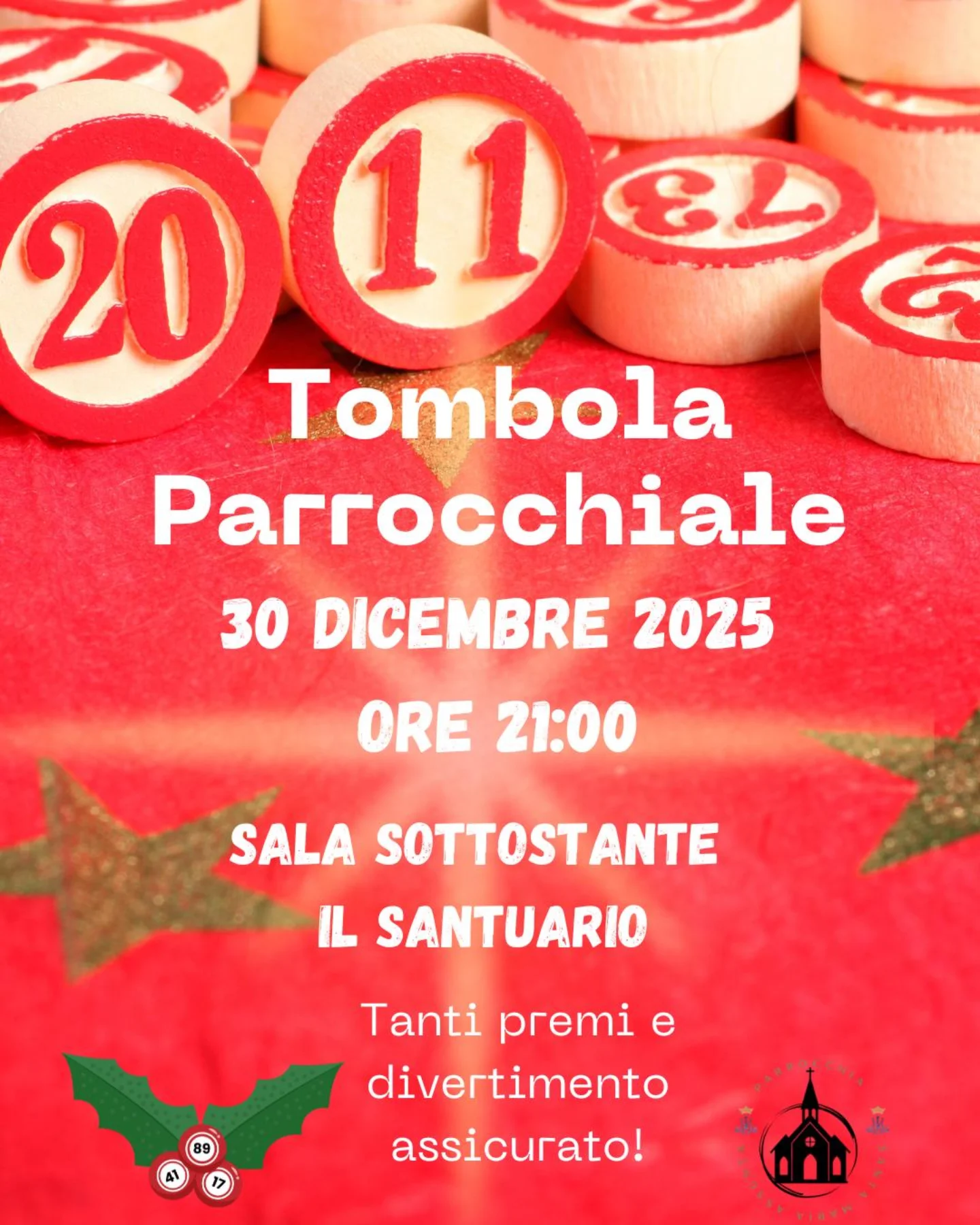 Unisciti a noi per una serata di divertimento il 30 dicembre 2025, con la tradizionale tombola parrocchiale. L’evento si svolgerà presso la Sala Sottostante il Santuario a Bagnoli del Trigno a partire dalle ore 21:00.