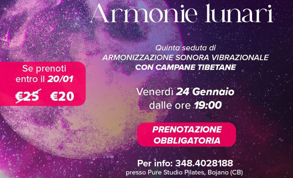 Partecipa alla quarta seduta di armonizzazione sonora vibrazionale con campane tibetane sul corpo. Questo evento si terrà venerdì 6 Dicembre dalle ore 18:00 presso Pure Studio Pilates a Bojano (CB).