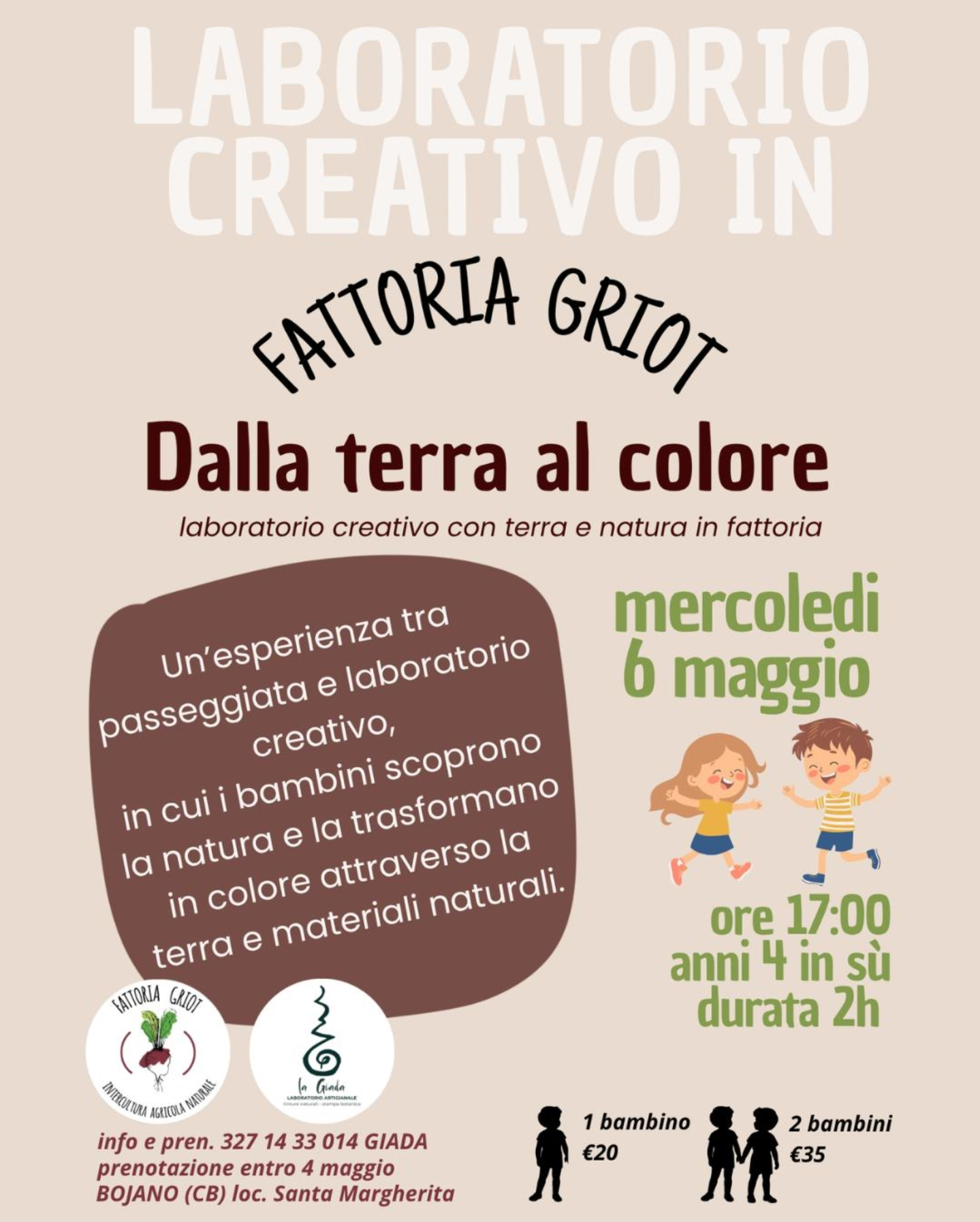 • Prezzo: 20€ per 1 bambino, 35€ per 2 bambini