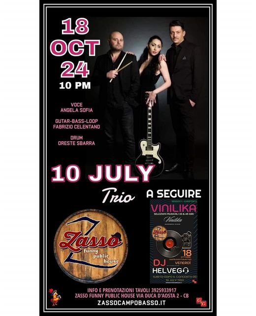 Unisciti a noi per una serata di grande musica al Zasso Funny Public House. Il concerto si terrà il 18 ottobre 2024 alle 22:00. La voce di Angela Sofia sarà accompagnata da Fabrizio Celentano alla chitarra, basso e loop e Oreste Sbarra alla batteria.