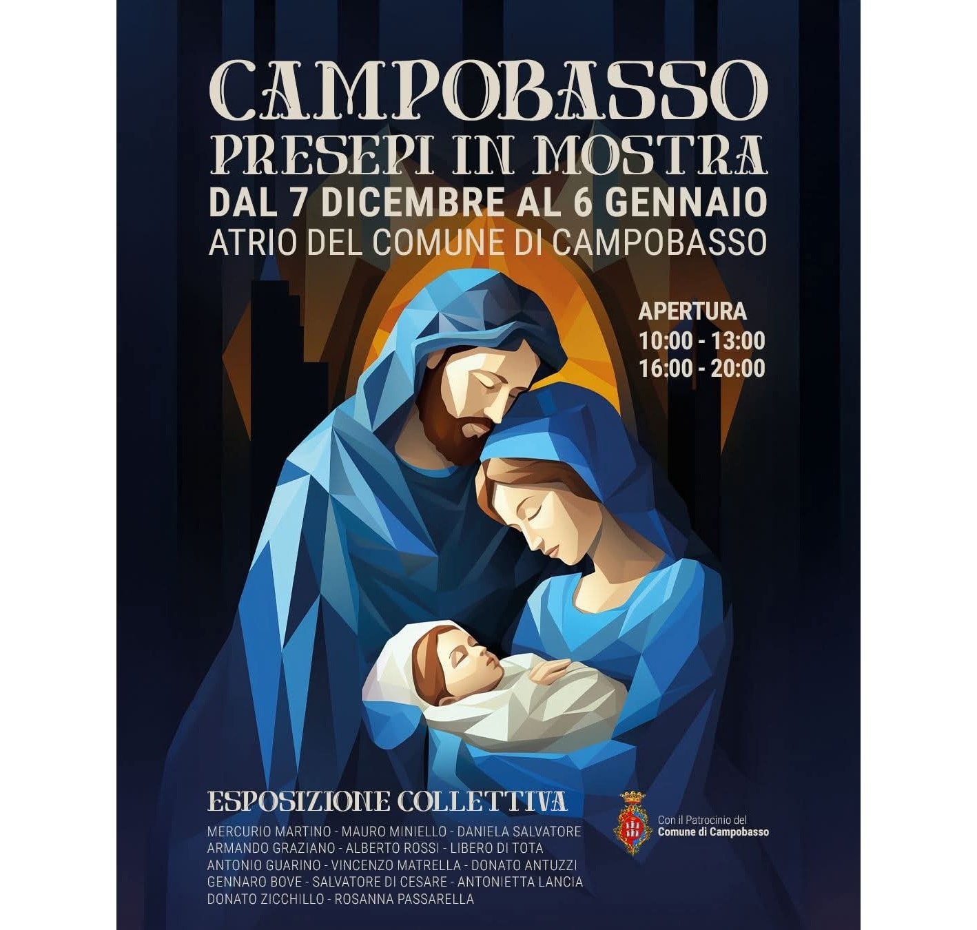 Dal 7 dicembre al 6 gennaio, presso l’atrio del Comune di Campobasso, si svolgerà una straordinaria esposizione collettiva di presepi. L’evento è patrocinato dal Comune di Campobasso e presenta opere di artisti locali.