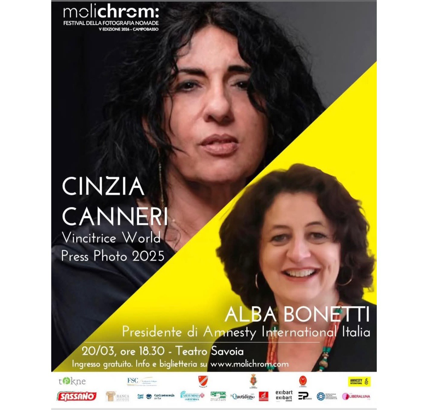 Un evento esclusivo che si svolgerà il 20 marzo 2026 al Teatro Savoia. Ospiti speciali includono Cinzia Canneri, vincitrice del World Press Photo 2025, e Alba Bonetti, Presidente di Amnesty International Italia. L’ingresso è gratuito!
