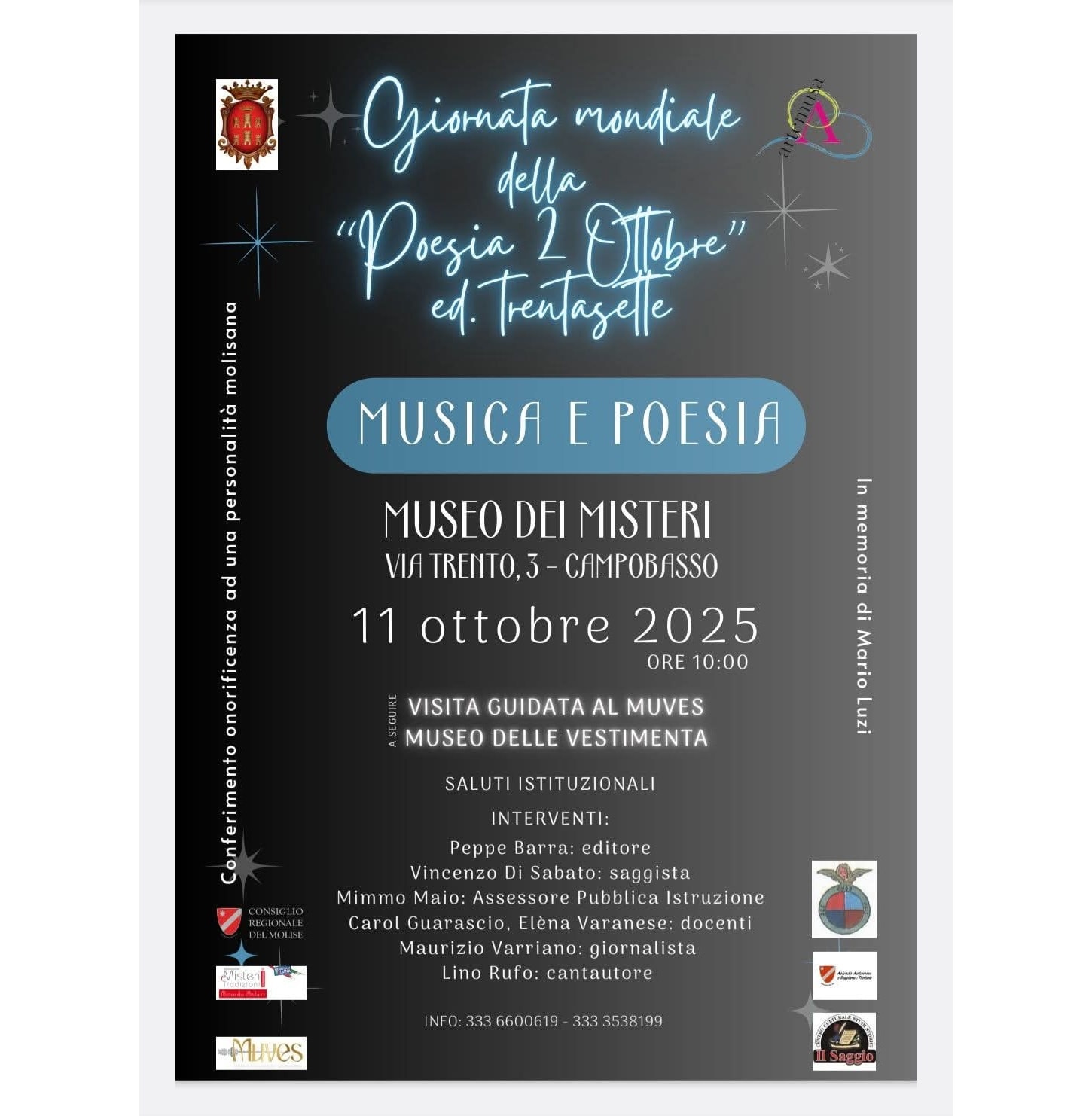 Unisciti a noi per la Giornata mondiale della ‘Poesia 2 Ottobre’, un evento speciale che celebra la musica e la poesia. L’evento avrà luogo al Museo dei Misteri, situato in Via Trento, 3 – Campobasso.