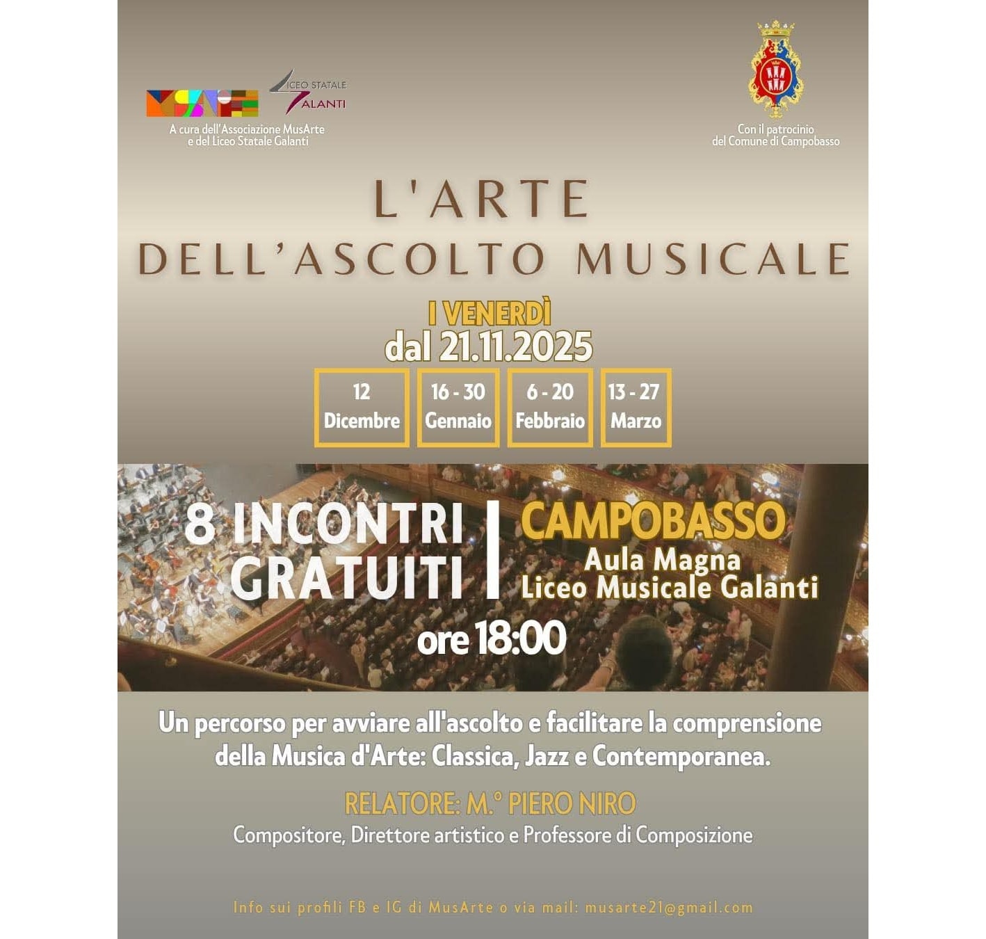 Un percorso unico e gratuito che si svolgerà presso la Aula Magna del Liceo Musicale Galanti a Campobasso. Ogni venerdì dal 21 novembre 2025 per migliorare l’ascolto della Musica d’Arte: Classica, Jazz e Contemporanea.