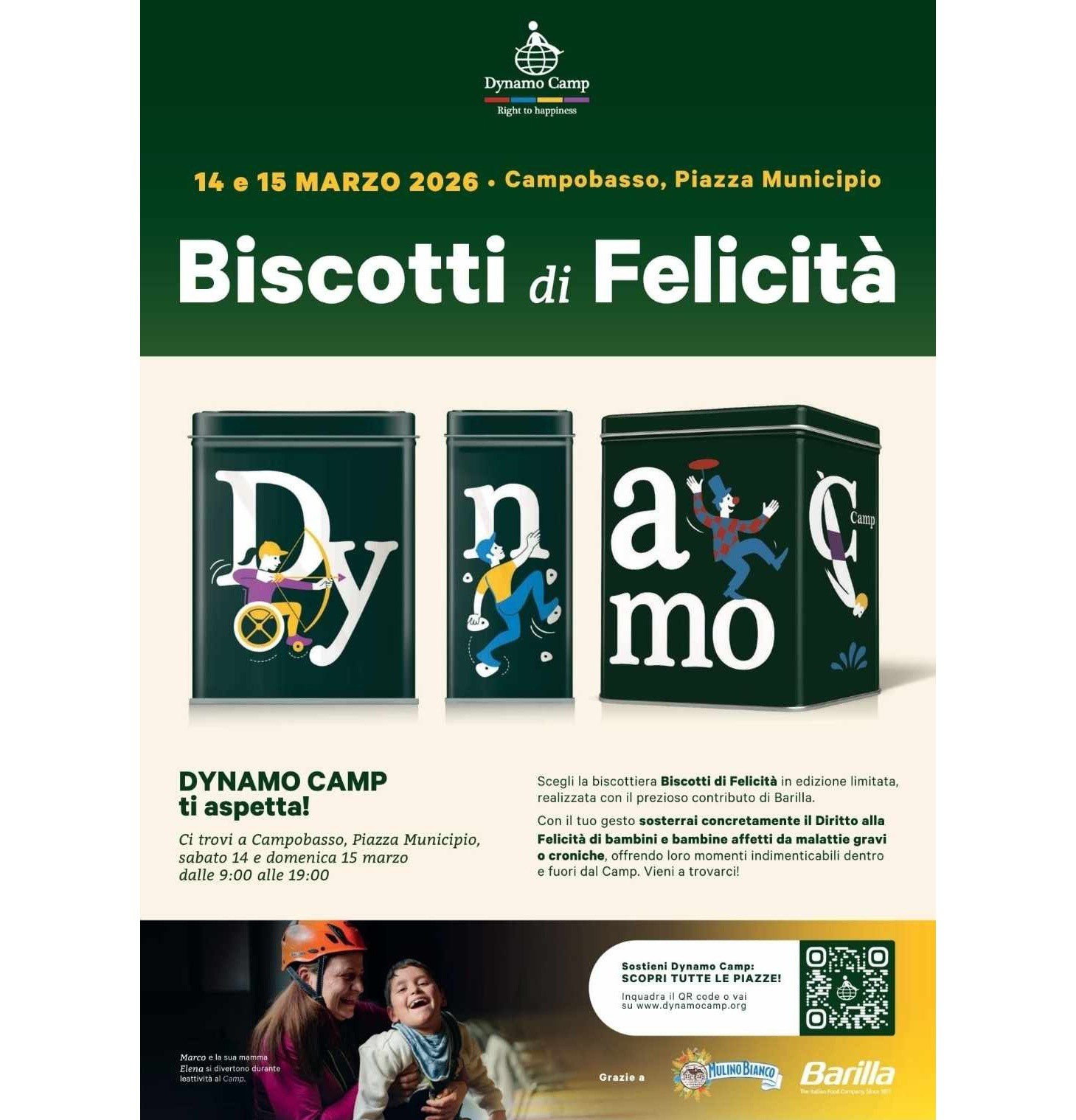 Vi aspettiamo a Campobasso, in Piazza Municipio, per l’evento Biscotti di Felicità, organizzato da Dynamo Camp in collaborazione con Barilla. Questo evento avrà luogo il 14 e 15 marzo 2026, dalle 9:00 alle 19:00.