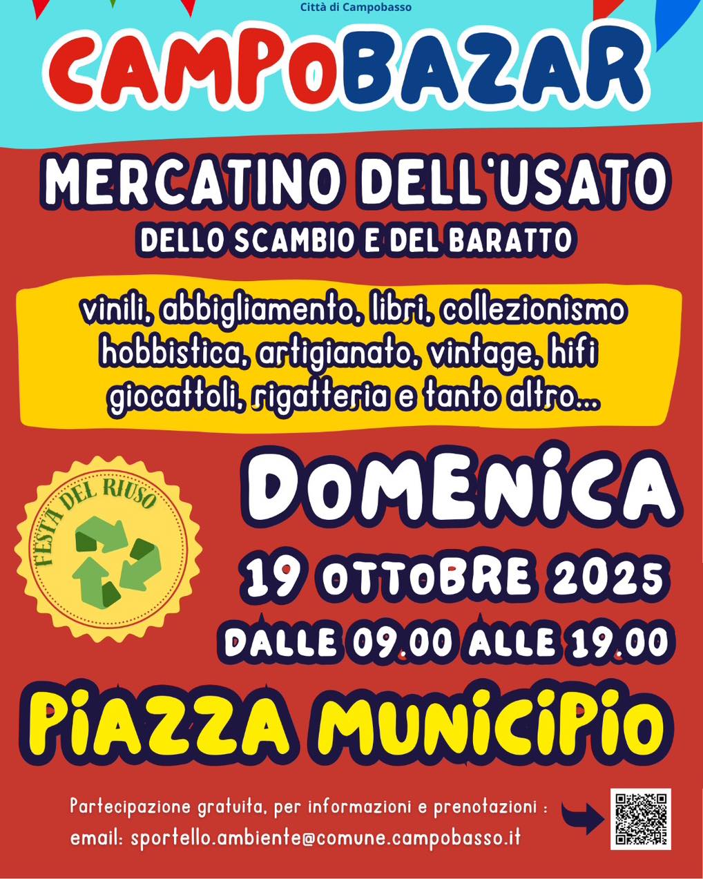 Domenica 19 ottobre 2025, Piazza Vittorio Emanuele II ospita una nuova edizione del mercatino dell’usato e dello scambio promosso dal Comune di Campobasso. Un’occasione gratuita e aperta a tutti per riscoprire il valore del riuso, allestire la propria bancarella e dare nuova vita agli oggetti dimenticati.