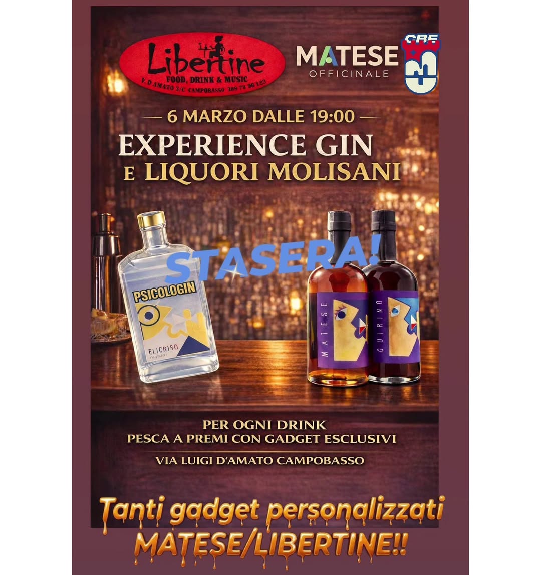 Unisciti a noi il 6 marzo 2026 a partire dalle 19:00 per una straordinaria serata di Experience Gin e liquori molisani. Ogni drink verrà accompagnato da gadget esclusivi e la possibilità di pescare premi! Non perdere l’occasione di scoprire i migliori gin e liquori della regione.