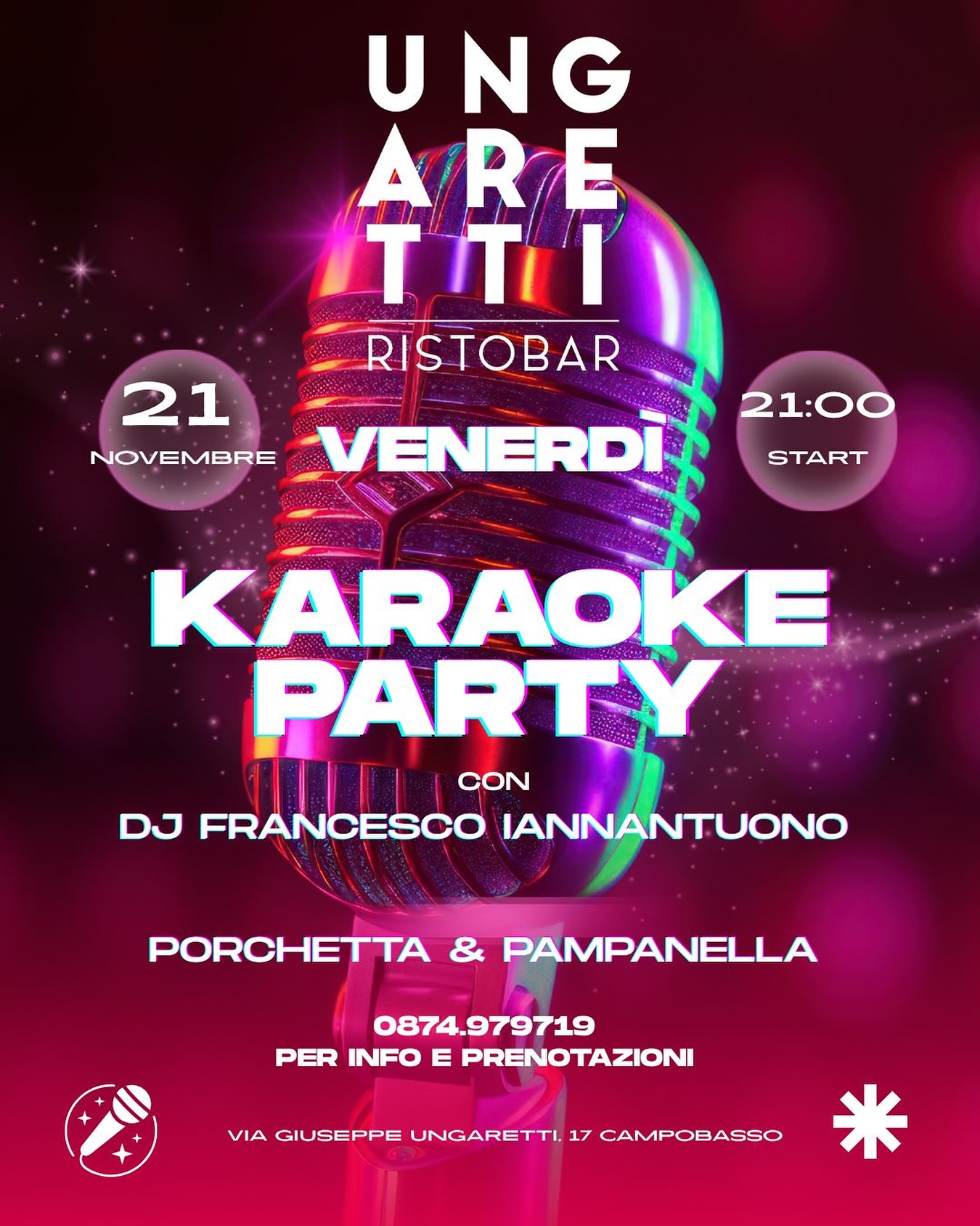 Venerdì 21 Novembre, unisciti a noi per un’emozionante serata di karaoke e divertimento con il noto DJ Francesco Iannantuono. Goditi la specialità della serata: Porchetta & Pampanella. Sarà una sera ricca di musica, gusto e tanto divertimento!