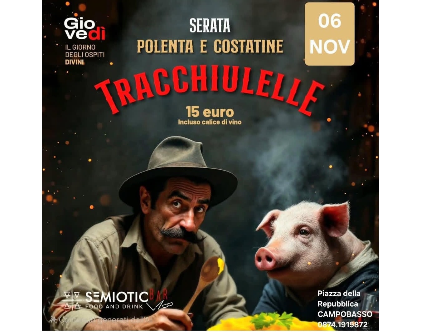 Unisciti a noi per una serata deliziosa centrata su polenta e costatine. Il costo è di 15 euro, che include un calice di vino. Non perdere questa opportunità di gustare i piatti tipici in un’atmosfera accogliente!