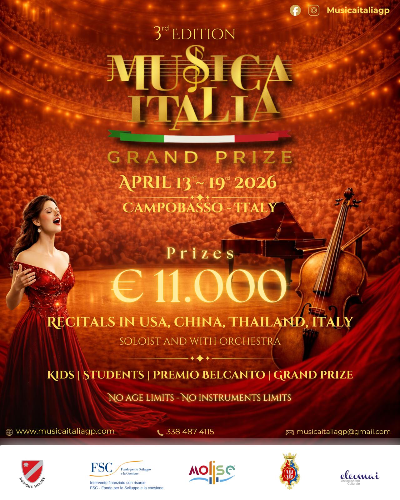 Partecipa al nostro straordinario festival musicale! Con premi di € 11.000 e recitals in USA, Cina, Thailandia e Italia. Aperto a solisti e orchestre.