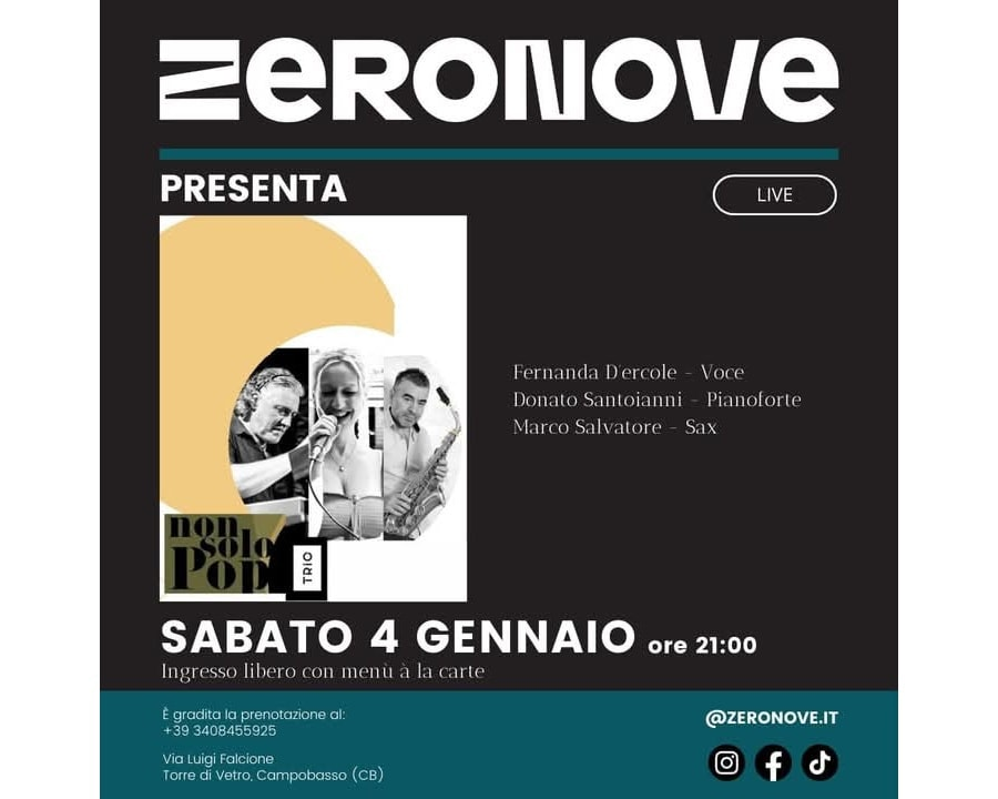 Unisciti a noi per una serata indimenticabile con il Non Solo Pop Trio, che si esibirà dal vivo. Il concerto si tiene il sabato 4 gennaio 2025 alle ore 21:00 presso il locale ZERONOVE a Torre di Vetro, Campobasso (CB).