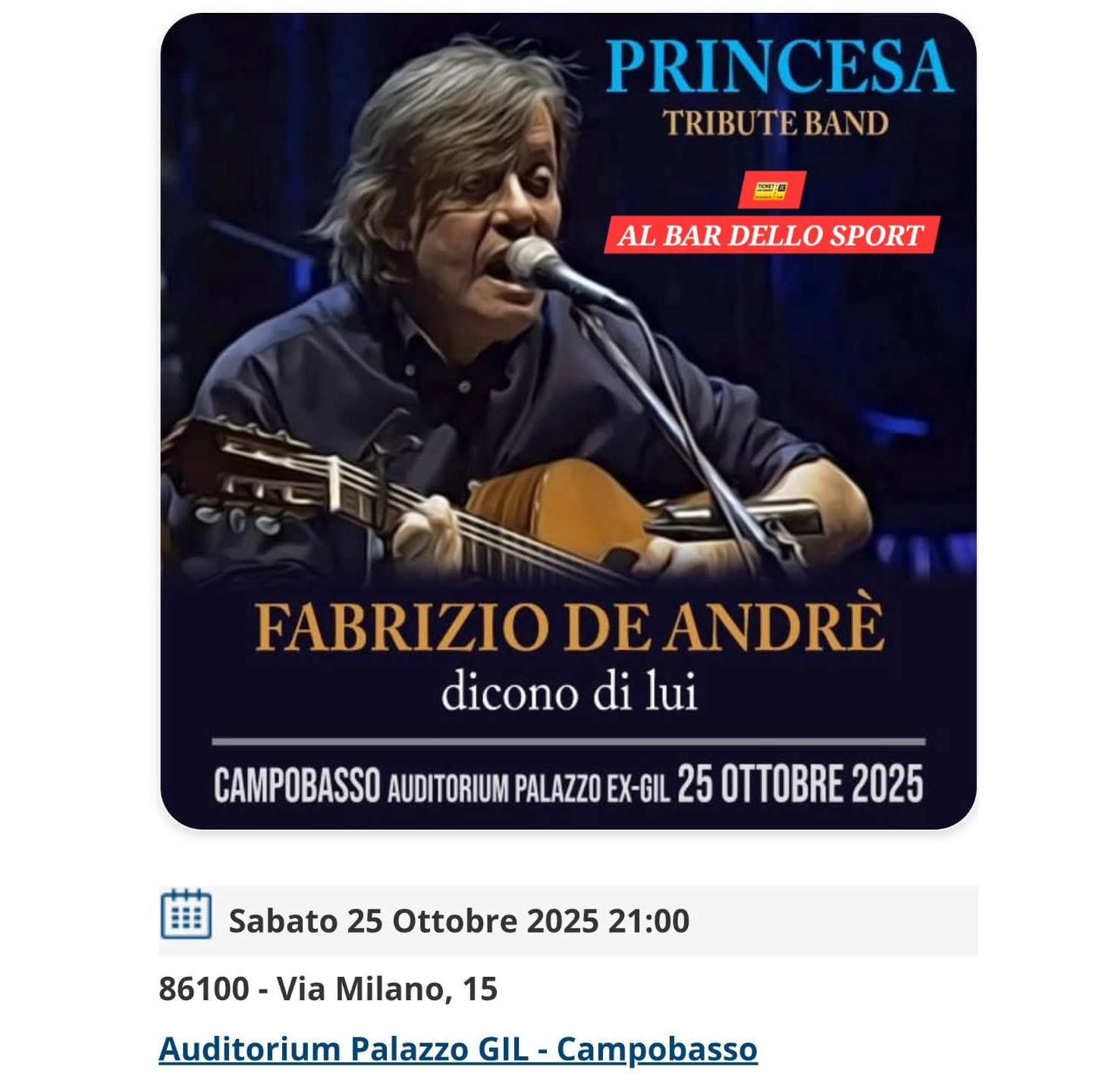 Un concerto emozionante in onore del grande cantautore Fabrizio De André, interpretato dalla band tribute Princesa. Non perderti questa occasione di rivivere i suoi capolavori!