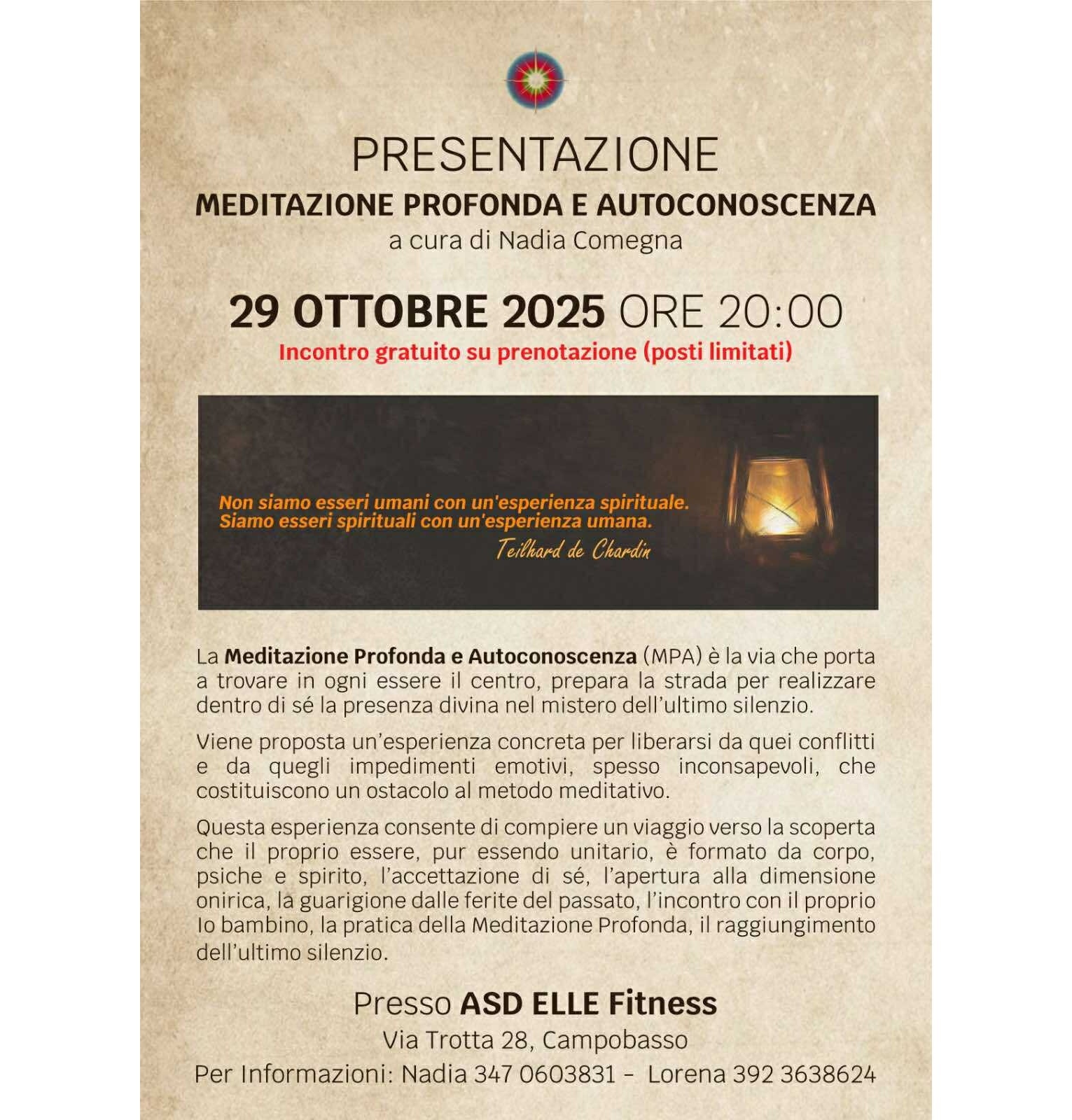 Il 29 Ottobre 2025 alle 20:00, si terrà un incontro gratuito su prenotazione, con posti limitati, per esplorare la Meditazione Profonda e Autoconsapevolezza a cura di Nadia Comegna.