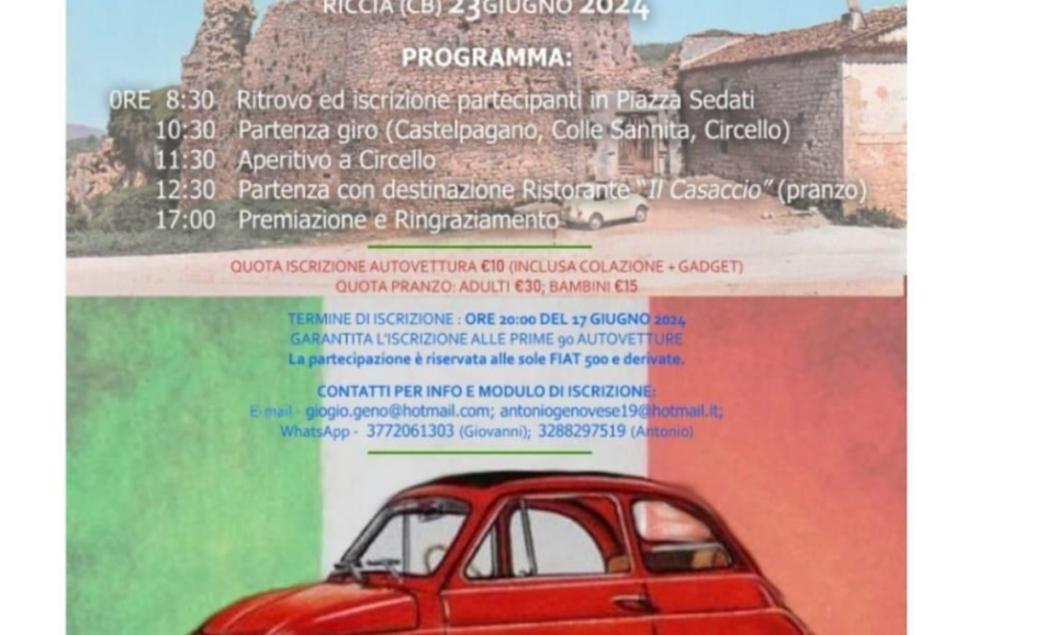 Il Club 500 Campobasso organizza il 18° Raduno Nazionale il 29 e 30 giugno 2024. Il programma include accoglienza presso l’Hotel PALMA, visite al Caseificio Artigianale ‘Colacicchio’, intrattenimenti serali, e la partecipazione al raduno con esposizione delle Fiat 500. La giornata del 30 giugno prevede un giro turistico, pranzo conviviale e premiazioni.