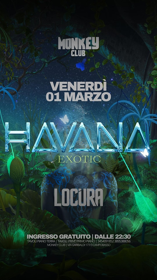 Il Monkey Club invita tutti a unirsi alla serata Havana Exotic Locura, un evento unico che porterà un tocco di esotico nella tua notte. L’ingresso è gratuito, assicurati di arrivare dalle 22:30 per goderti al meglio l’atmosfera e la musica.