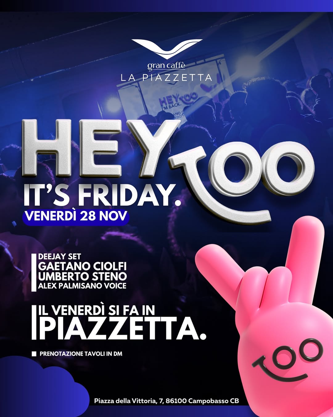 Unisciti a noi per una serata di musica e divertimento presso La Piazzetta. Ogni venerdì, puoi gustare un deejay set con Gaetano Ciolfi e Umberto Steno, con la voce di Alex Palmisano. Prenota il tuo tavolo per non perdere l’occasione di vivere al meglio il venerdì sera in compagnia!