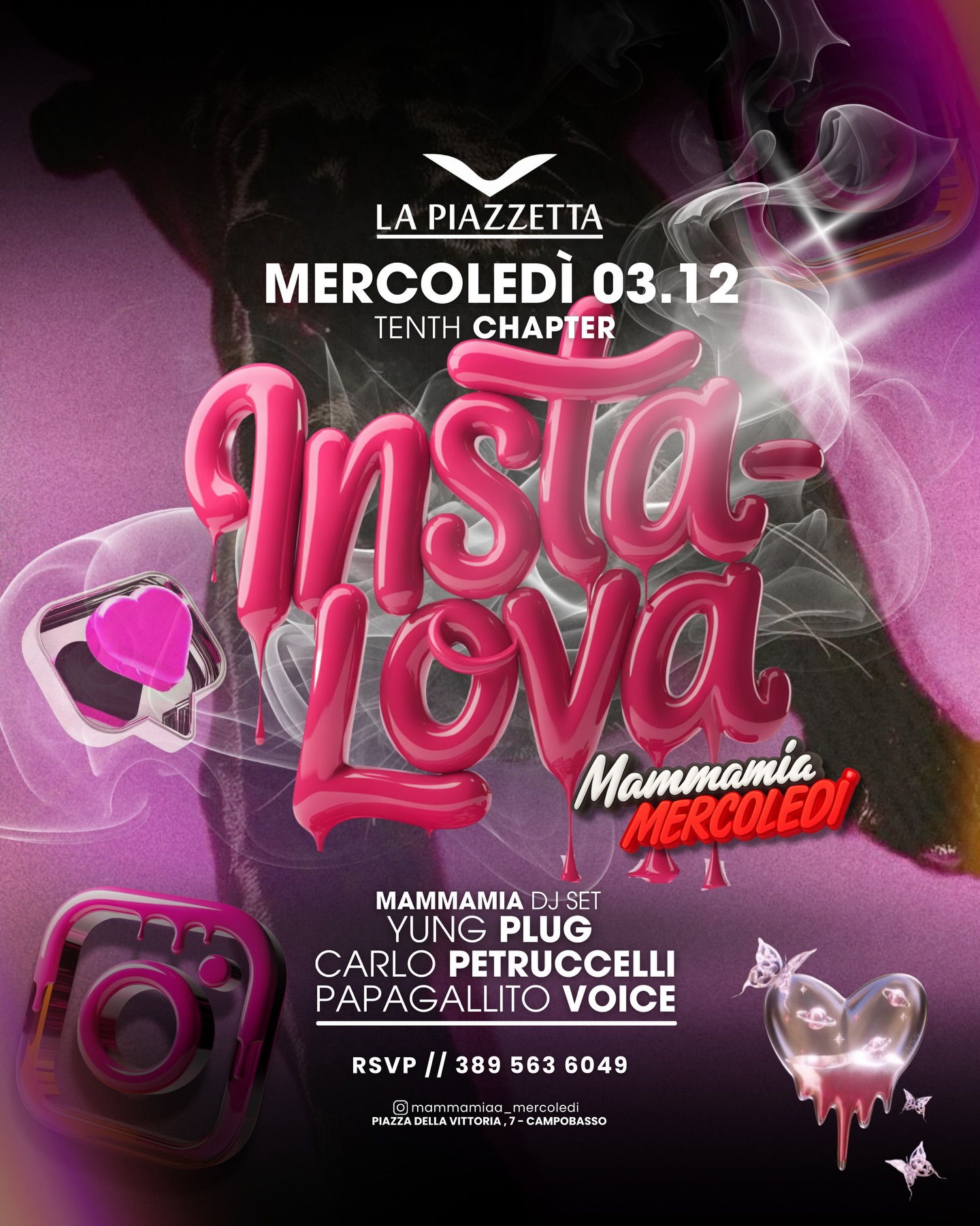 Preparati a vivere un nuovo capitolo del format più amato del mercoledì! Insta-Lova ti porta in un mondo fatto di vibrazioni pink, cuori digitali e un’atmosfera che solo Mammamia può creare.