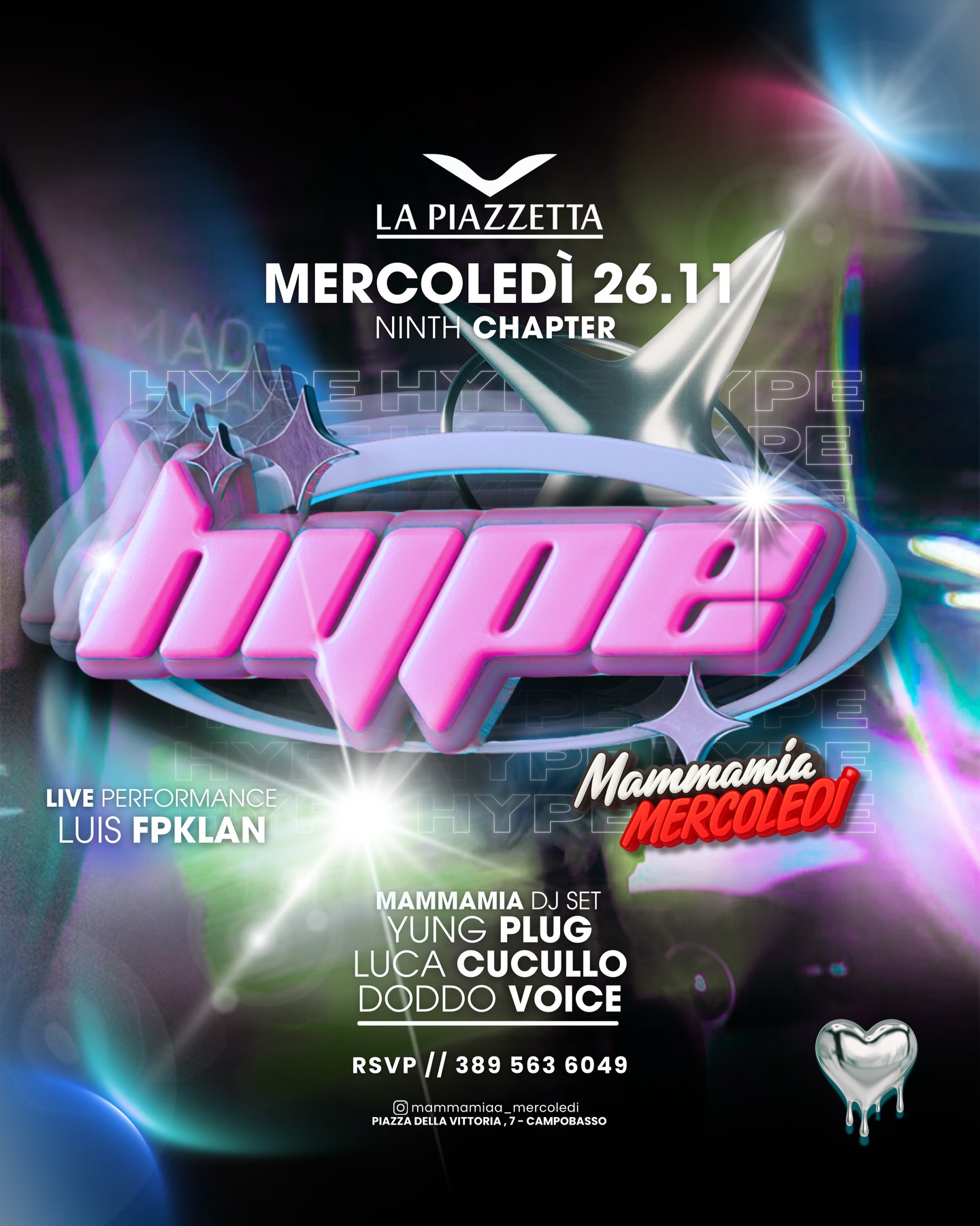 Unisciti a noi per una notte di pura energia e divertimento a La Piazzetta! Il 26 novembre 2025, preparati per una live performance di Luis FPKLAN e il DJ set di Yung Plug, Luca Cucullo e Doddo Voice.