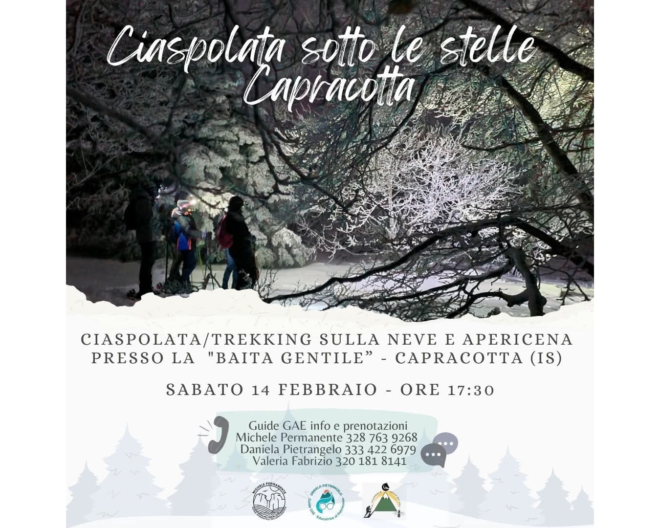 Unisciti a noi per una fantastica ciaspolata/trekking sulla neve presso la ‘Baita Gentile’ a Capracotta (IS). L’evento si svolgerà il 14 febbraio 2026 alle 17:30. L’attività comprende un percorso immerso nella natura e si concluderà con un’apericena sotto il cielo stellato.