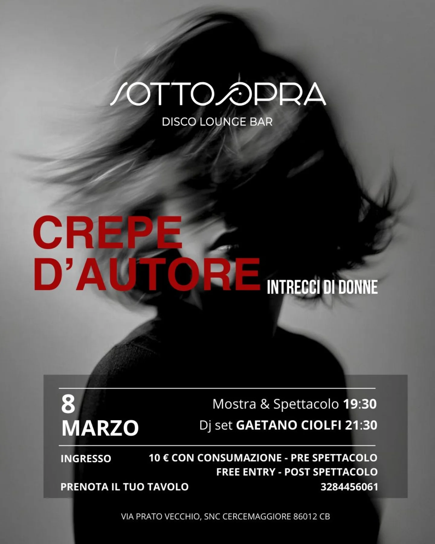 Unisciti a noi per ‘Crepe d’Autore’, un evento che celebra l’arte e le donne con una mostra e uno spettacolo. Inizia alle 19:30 con una mostra, seguita dal dj set di Gaetano Ciofli alle 21:30.