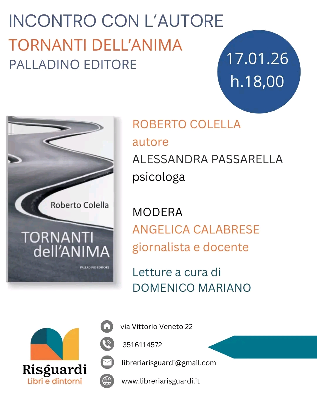 Sabato 17 gennaio alle 18, parleremo di Tornanti dell’anima di Roberto Colella (Palladino Editore). Sarà un incontro corale e aperto, in cui il libro diventa un punto di partenza per riflettere insieme.