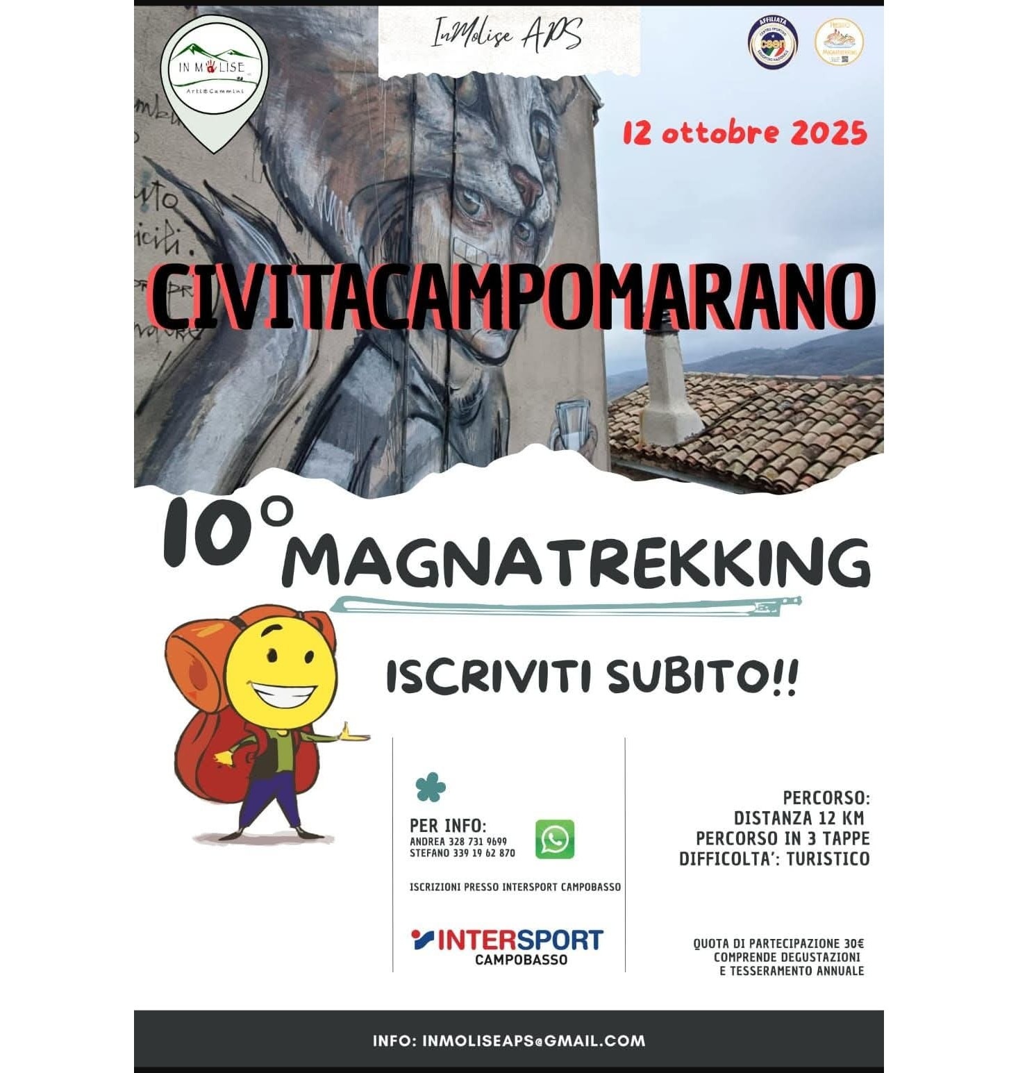 Unisciti a noi il 12 ottobre 2025 per il decimo Magnatrekking a Civita Campomarano! Un percorso turistico di 12 km, suddiviso in 3 tappe, dedicato a tutti gli amanti della natura e della gastronomia.