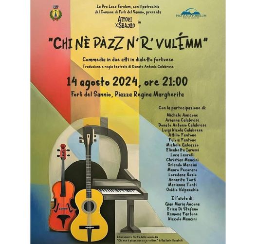Il 14 agosto 2024, alle ore 21:00, goditi una serata indimenticabile nella suggestiva Piazza Regina Margherita di Forlì del Sannio con la commedia dialettale “Chi nè pazz n’ r’ vilemm”.