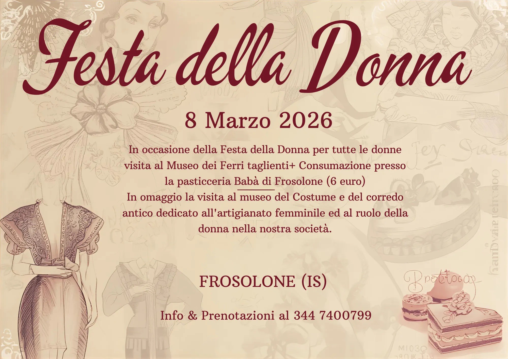 In occasione della Festa della Donna, tutte le donne sono invitate a visitare il Museo dei Ferri taglienti. Questo evento include anche una consumazione presso la pasticceria Babà di Frosolone (6 euro).