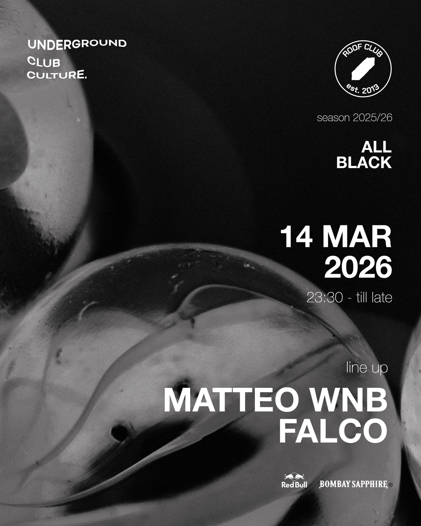 Sabato 14 Marzo 2026, dalle 23:30 fino a tardi, il Roof Club presenta una serata speciale con il tema ‘All Black’. Non perdere l’opportunità di ballare con i DJ Matteo WNB & Falco.
