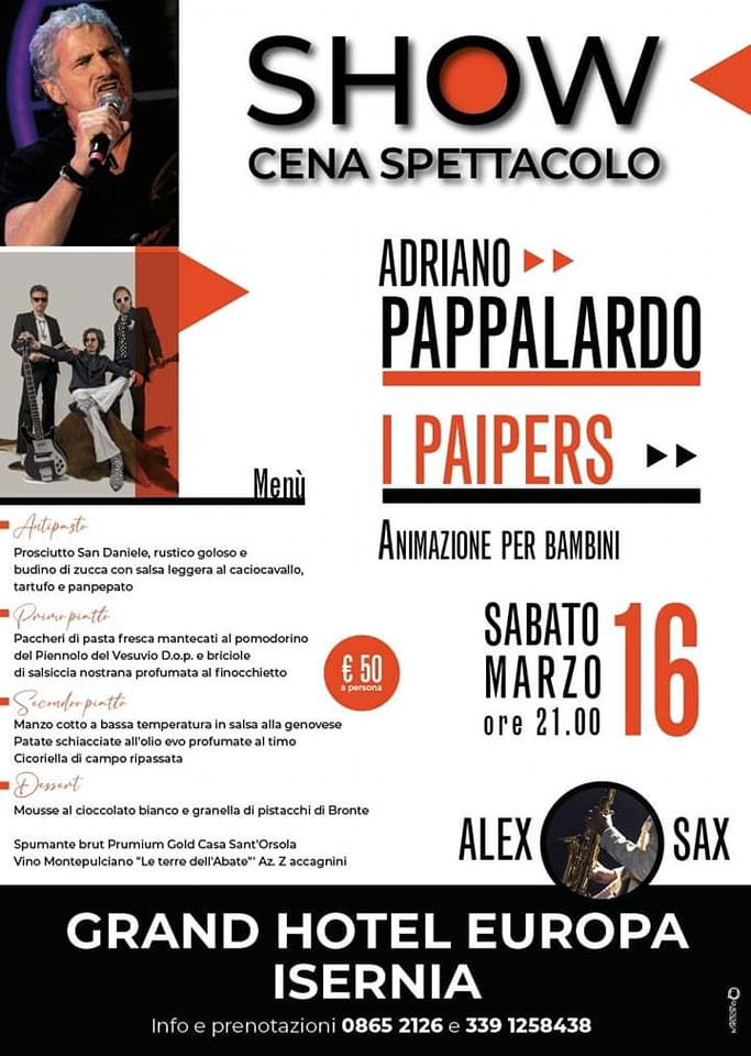 Goditi una serata all’insegna del divertimento al Grand Hotel Europa con un’ottima cena e la musica live di Adriano Pappalardo e I Paipers. Sarà presente anche l’animazione per bambini e un’esibizione di Alex al sax.