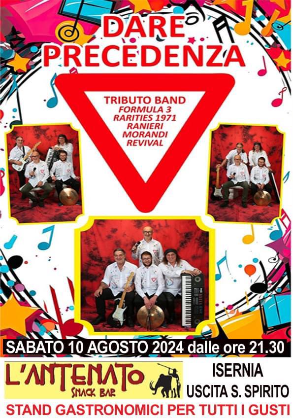 Non perdere l’occasione di assistere a un fantastico concerto tributo alla musica italiana con la band Dare Precedenza! Essa interpreta i brani più iconici di Formula 3, Rarities 1971, Ranieri e Morandi. L’evento si svolgerà sabato 10 agosto 2024 a partire dalle ore 21.30 presso L’Antenato Snack Bar, Isernia.