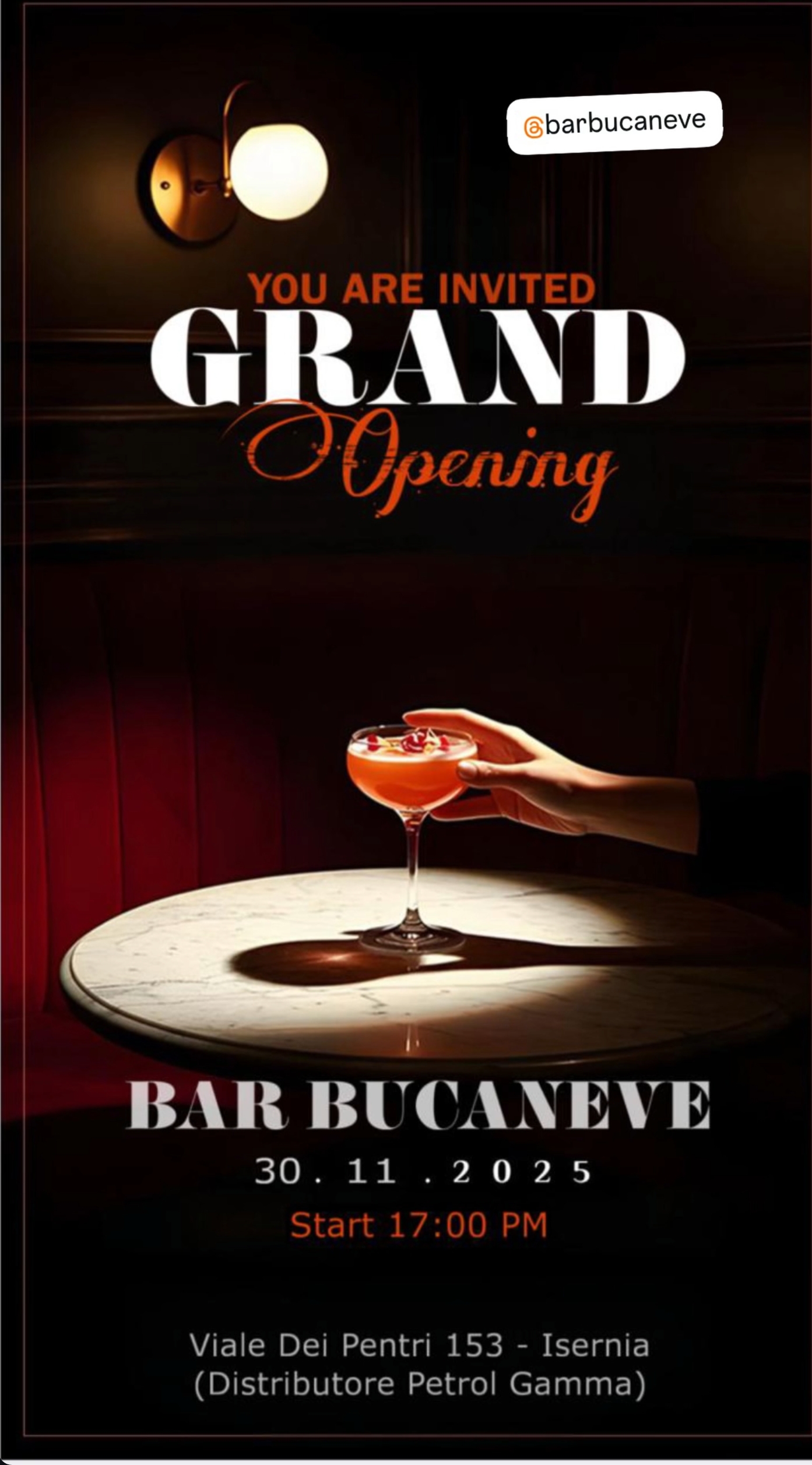 Sei invitato a un evento speciale! Unisciti a noi per celebrare l’apertura del Bar Bucaneve, un nuovissimo locale che promette serate indimenticabili. Goditi drink straordinari e un’atmosfera rilassante a partire dalle 17:00.