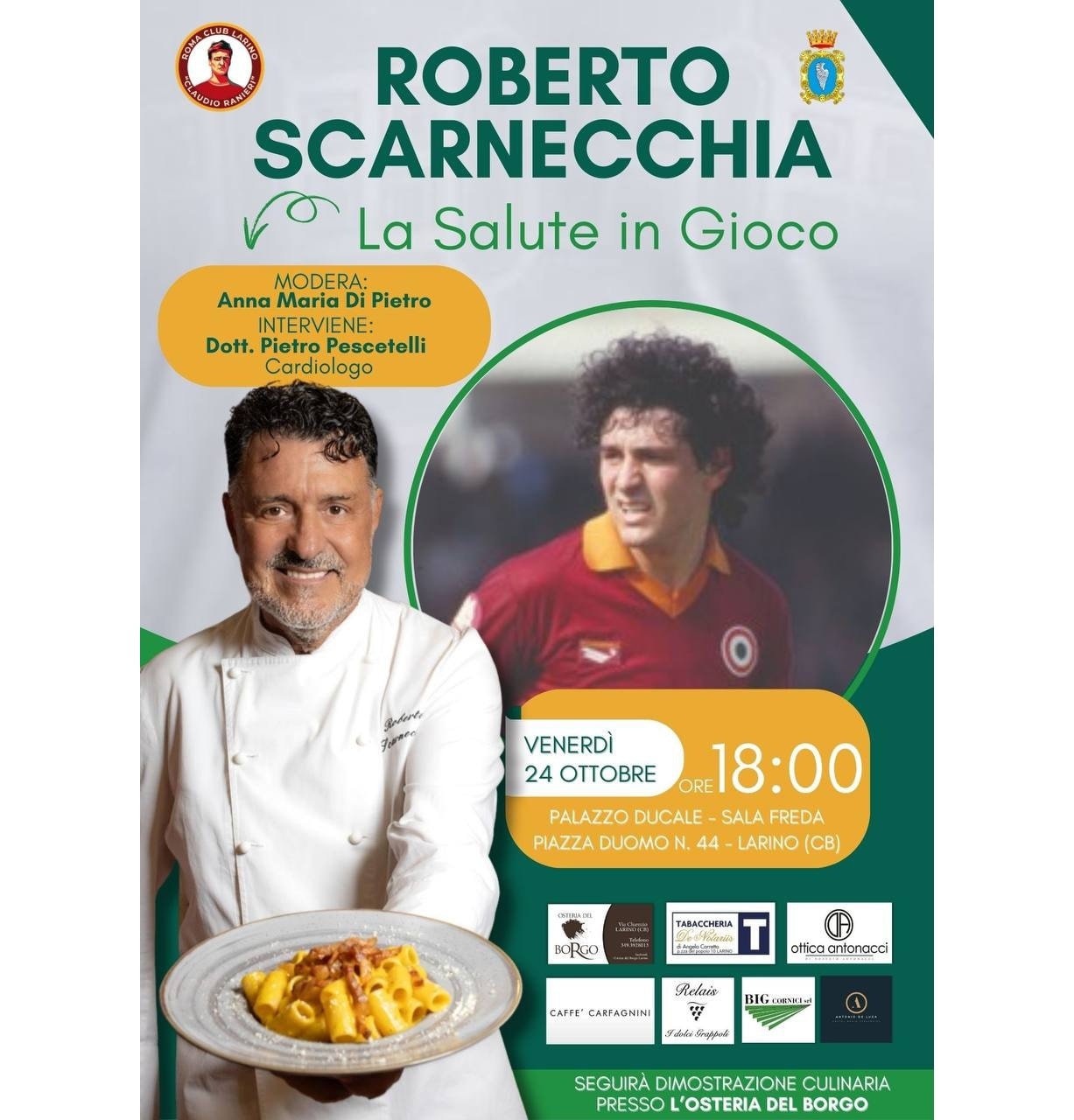 Un incontro speciale con il noto chef Roberto Scarnecchia e il cardiologo Dott. Pietro Pescatelli, moderato da Anna Maria Di Pietro, si terrà il 24 ottobre 2025 presso il Palazzo Ducale di Larino. L’evento includerà una dimostrazione culinaria nella quale verranno presentati piatti tipici, evidenziando l’importanza della sana alimentazione per uno stile di vita attivo.