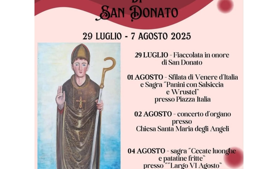 Il Corteo Storico Processionale si terrà il 07 agosto 2024 a Longano, a partire dalle 17:30. Questo evento annuale celebra la figura di San Donato con una parata che ripercorre le tradizioni storiche della comunità.