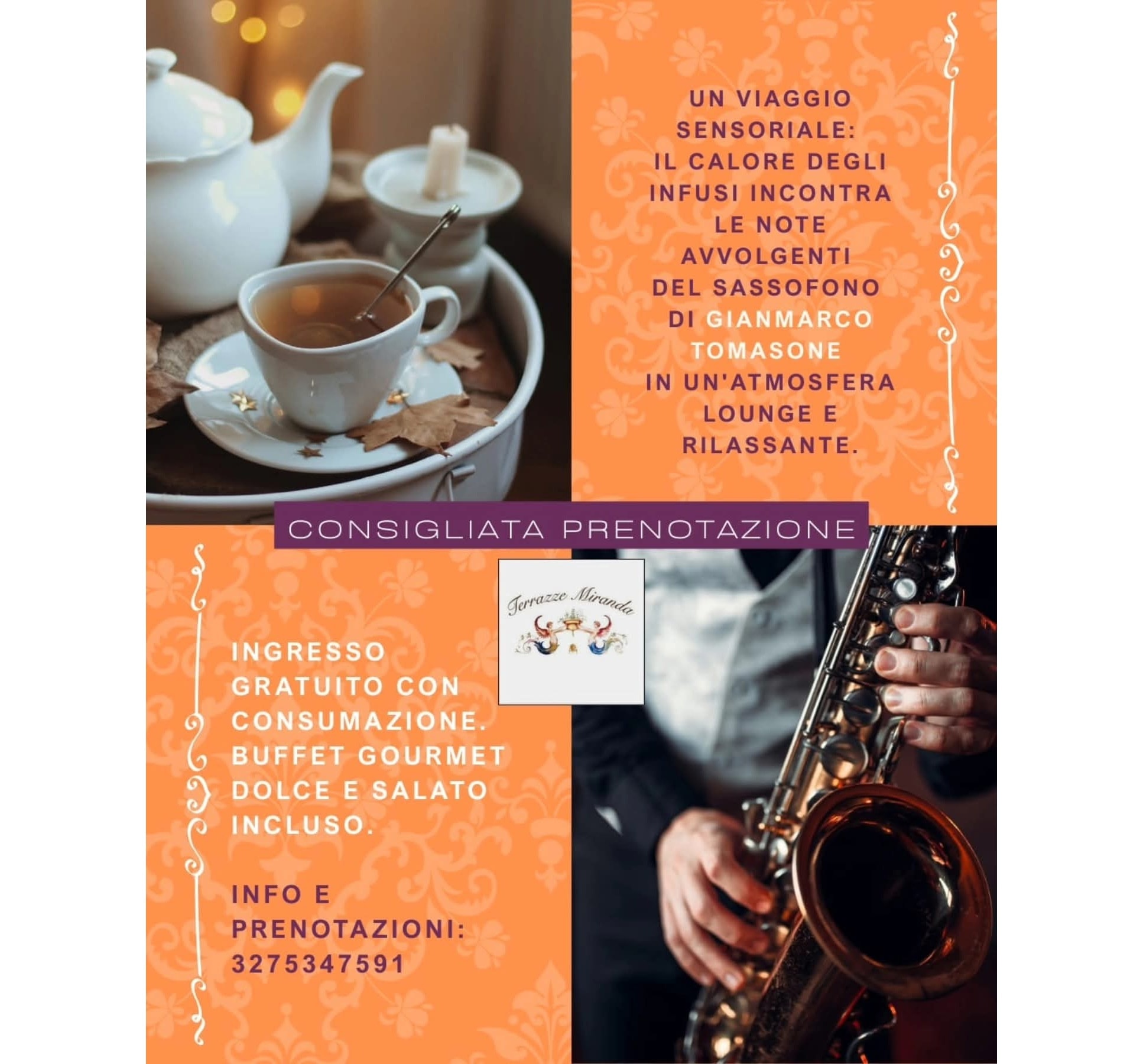 Un viaggio sensoriale: il calore degli infusi incontra le note avvolgenti del sassofono di Gianmarco Tomasoni in un’atmosfera lounge e rilassante.