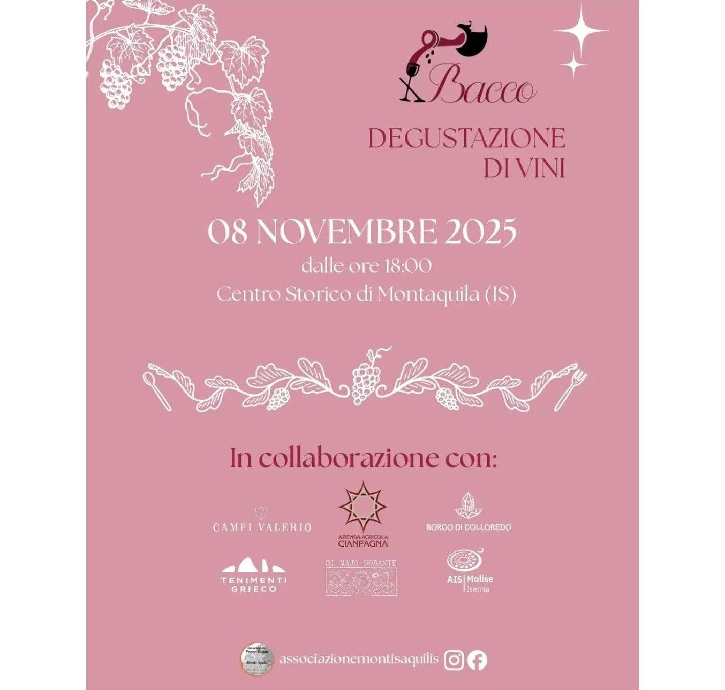 Partecipa alla Degustazione di Vini che si terrà il 8 Novembre 2025, a partire dalle 18:00, nel Centro Storico di Montaquila (IS). Scopri una varietà di vini locali in un ambiente accogliente e ricco di storia.