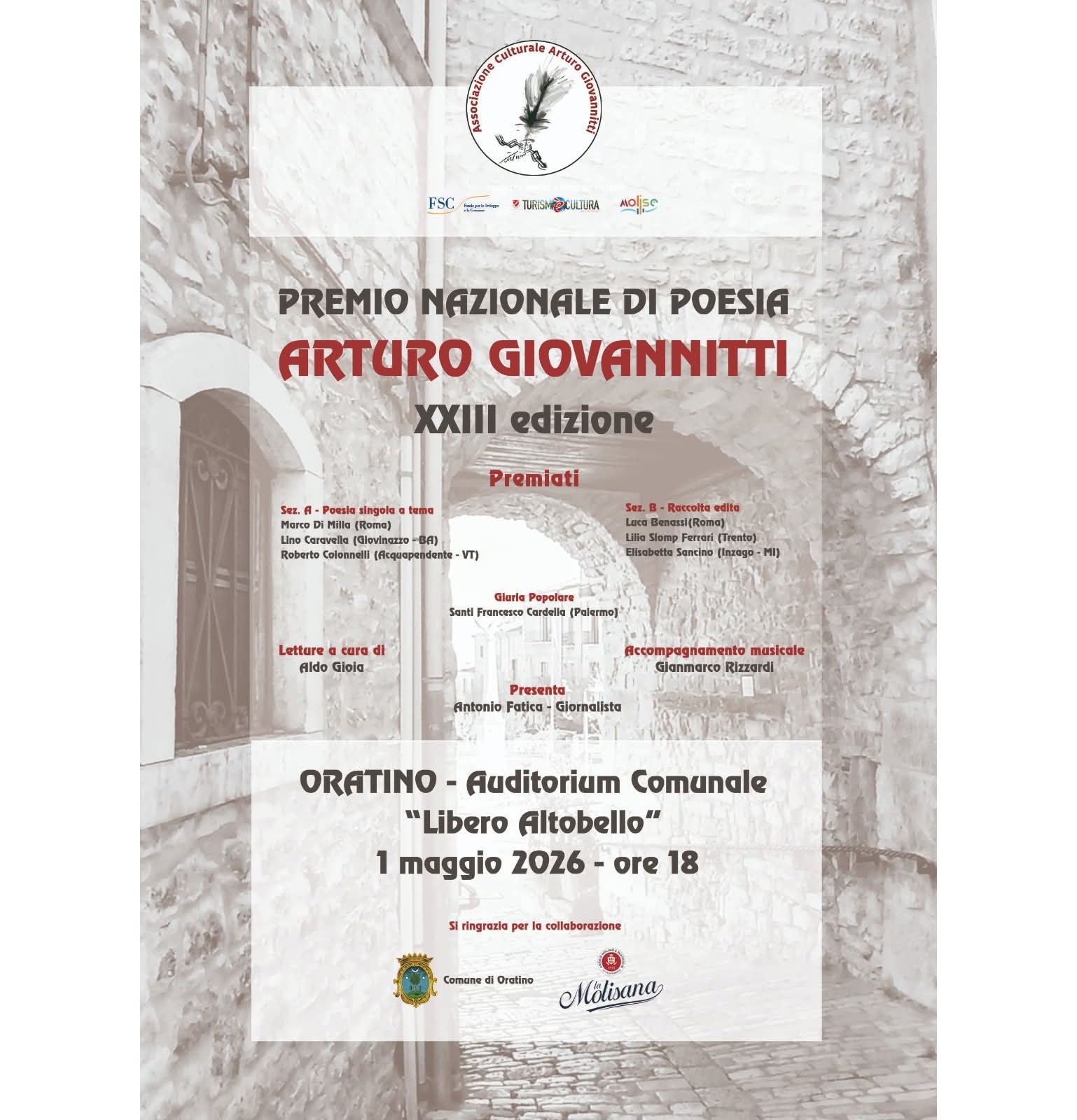 Il 1 maggio 2026, presso l’Auditorium Comunale “Libero Altobello” di Oratino, avrà luogo la XXIII edizione del Premio Nazionale di Poesia Arturo Giovanitti.