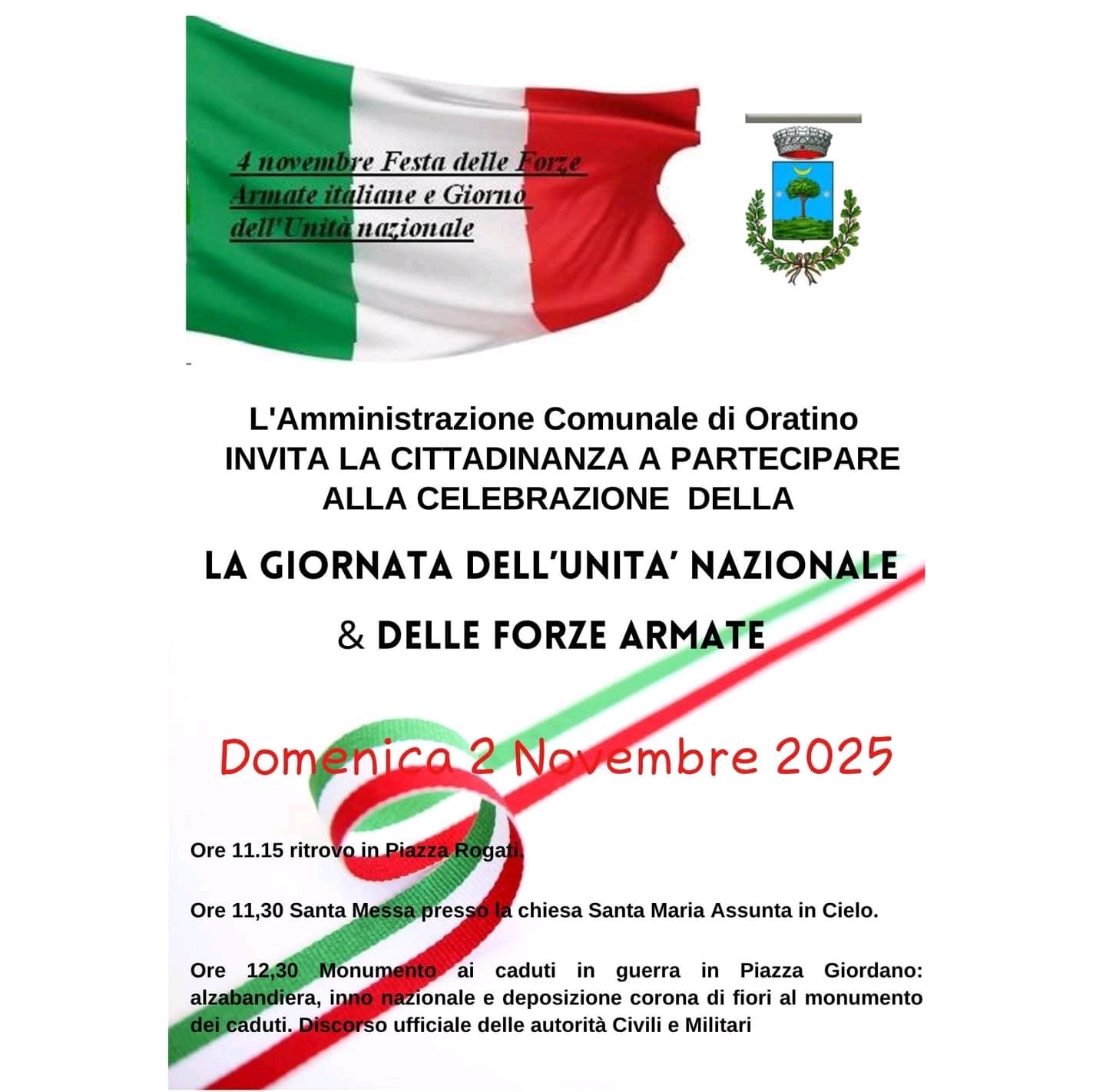 L’Amministrazione Comunale di Oratino invita la cittadinanza a partecipare alla celebrazione della Giornata dell’Unità Nazionale e delle Forze Armate.