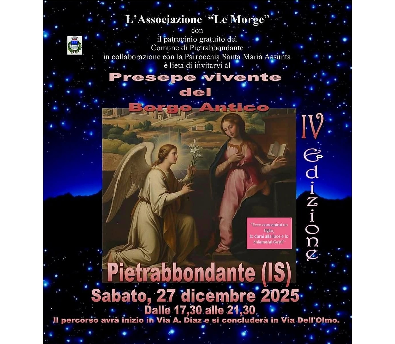 L’Associazione “Le Morghe”, con il patrocinio gratuito del Comune di Pietrabondante e in collaborazione con la Parrocchia Santa Maria Assunta, è lieta di invitarti al Presepe vivente del Borgo Antico.