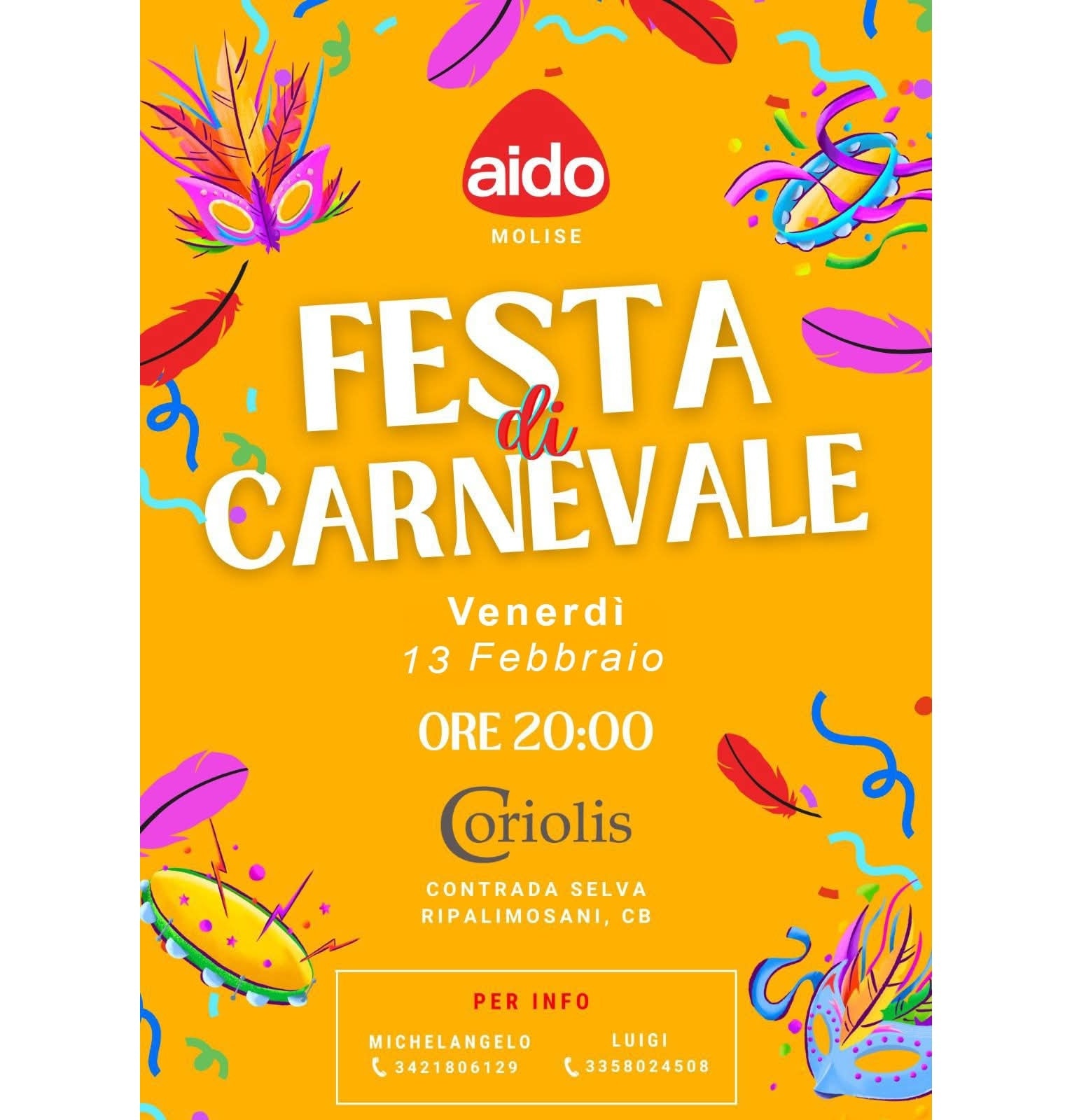 Unisciti a noi per una serata indimenticabile alla Festa di Carnevale! Festeggia con noi il 13 febbraio alle 20:00 presso Coriolis, situato in Contrada Selva, Ripalimosani, CB. Sarà un evento ricco di colori, divertimento e tanta musica!