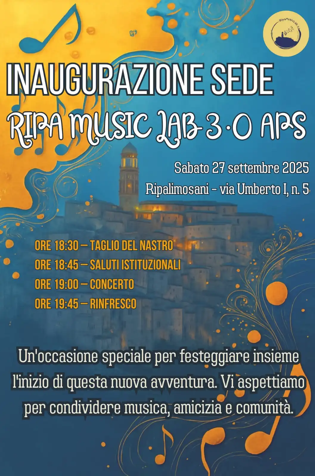 Sabato 27 settembre 2025, si terrà l’inaugurazione della sede del RIPA Music Lab 3.0 APS, un evento dedicato alla musica e alla comunità.