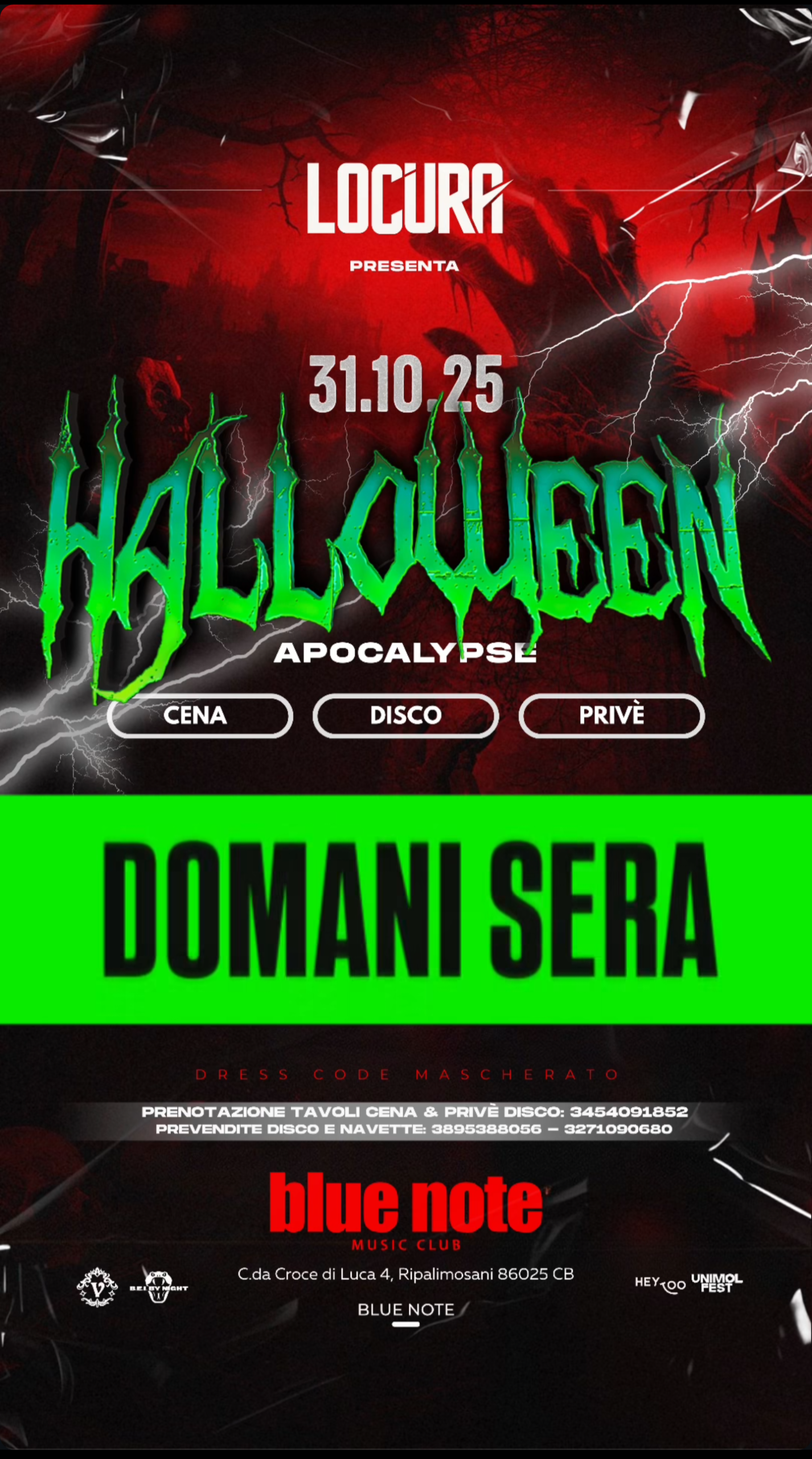 Unisciti a noi per una notte indimenticabile di festa e divertimento al Blue Note Music Club il 31 ottobre 2025! Preparati per una serata di cena, disco e privè con un tema spaventoso. Ricorda, il dress code è mascherato!