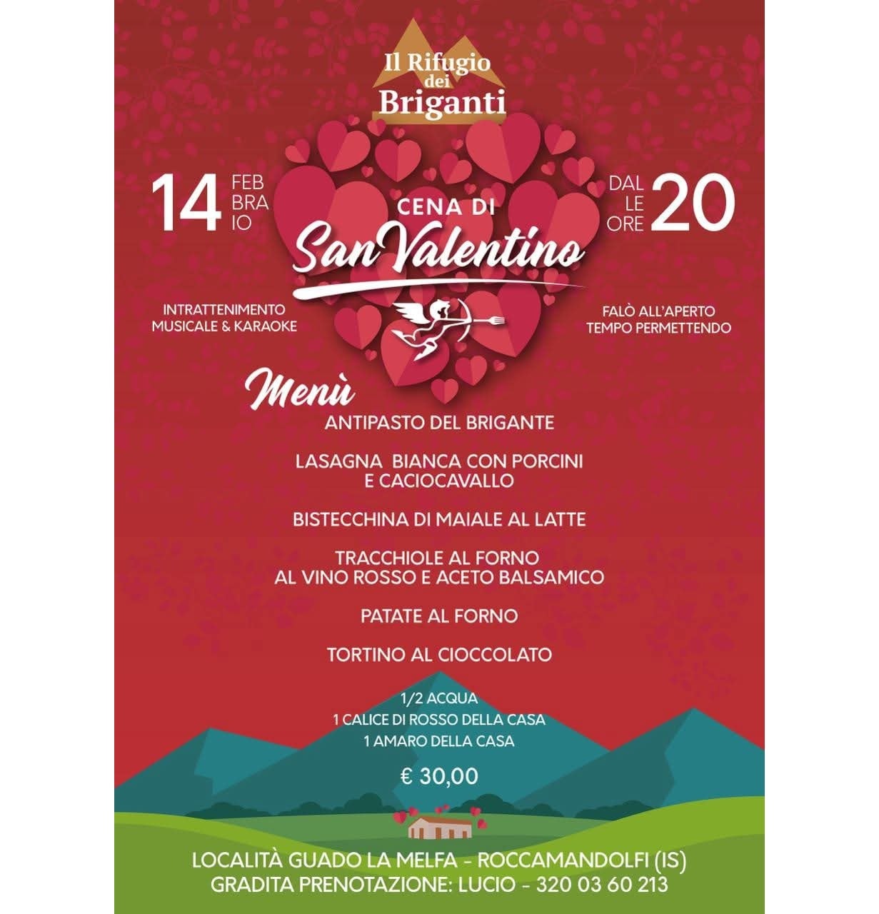 Unisciti a noi per una speciale cena di San Valentino al Rifugio dei Briganti, con un menù delizioso e intrattenimento musicale. L’evento inizia alle ore 20:00 e si svolgerà all’aperto se il tempo lo permette.