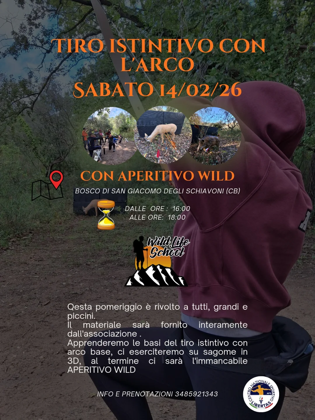 Vivi un’esperienza unica al Bosco di San Giacomo degli Schiavoni (CB). Un pomeriggio all’insegna del tiro istintivo con l’arco, adatto a tutti, grandi e piccini. Impara a centrare il bersaglio e termina la giornata con un irresistibile Aperitivo Wild.