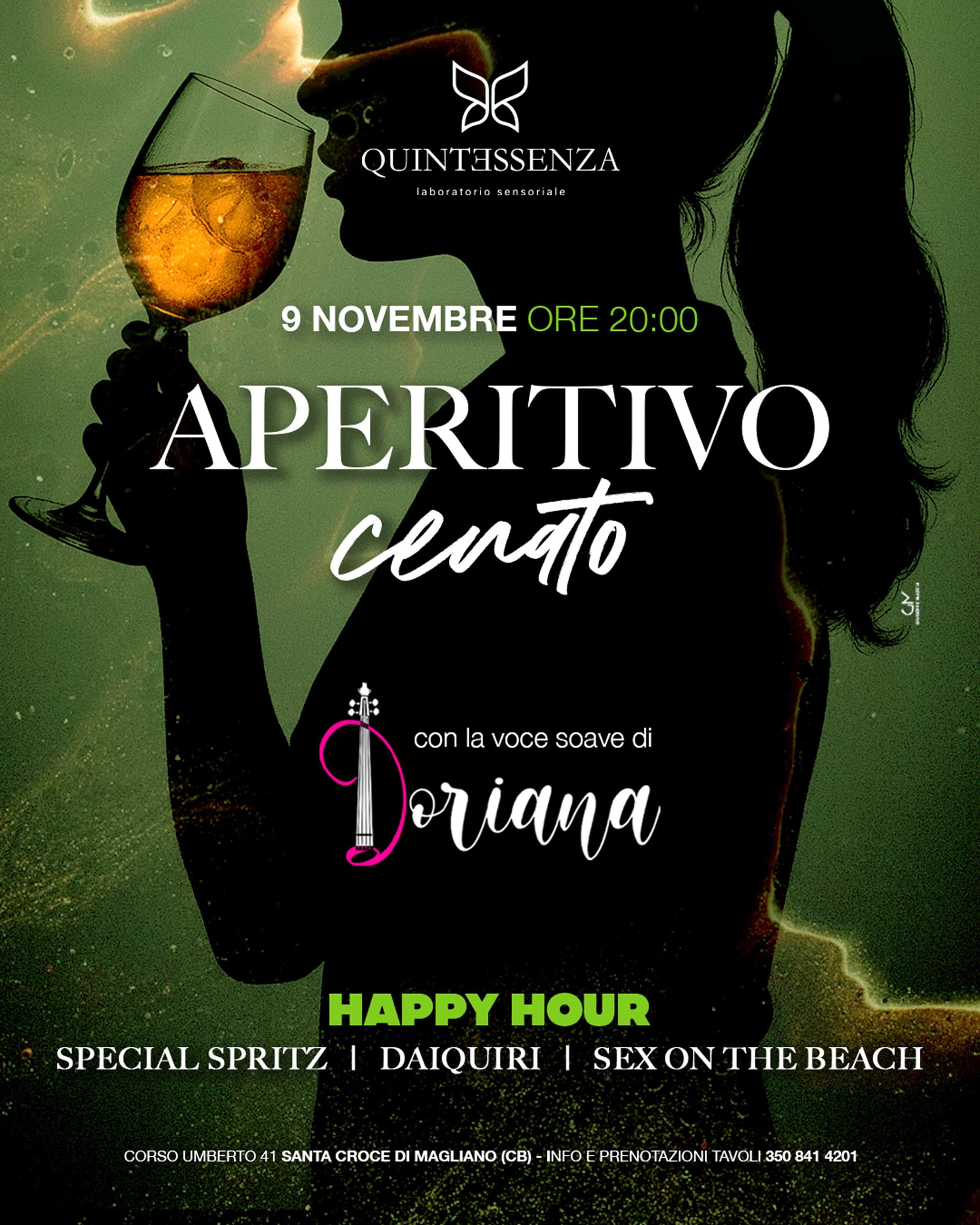 Unisciti a noi per una serata indimenticabile il 9 novembre 2025 alle ore 20:00. Gusta i nostri special spritz e altri cocktail mentre ti allietiamo con la voce suave di Doriana.