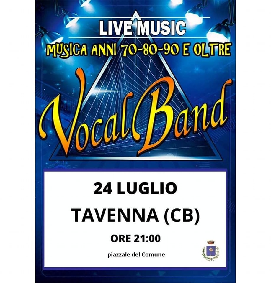 Unisciti a noi per un’incredibile serata di musica dal vivo con la Vocal Band. Il concerto si terrà il 24 luglio 2024 a Tavenna (CB) nel piazzale del Comune, a partire dalle 21:00.