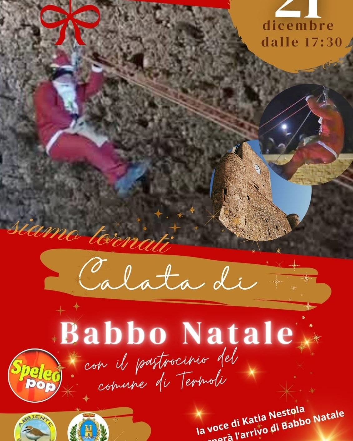 Per il secondo anno, in occasione del “Natale a Termoli”, torna l’appuntamento con la Calata di Babbo Natale dal Castello Svevo. Domenica 21 dicembre alle ore 17.30, Babbo Natale scenderà dal Castello Svevo, accompagnato dalla voce di Katia Nestola, per regalare emozioni a grandi e piccini. Un momento magico organizzato da Speleo Pop in collaborazione con il Comune di Termoli e l’associazione Ambiente Basso Molise.
