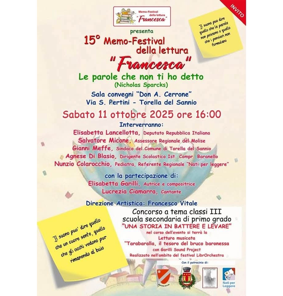 Il 15° Memo-Festival della lettura, intitolato ‘Francesca’, si terrà il sabato 11 ottobre 2025 alle ore 16:00 presso la sala convegni ‘Don A. Cerrone’, Via S. Pertini a Torella del Sannio.