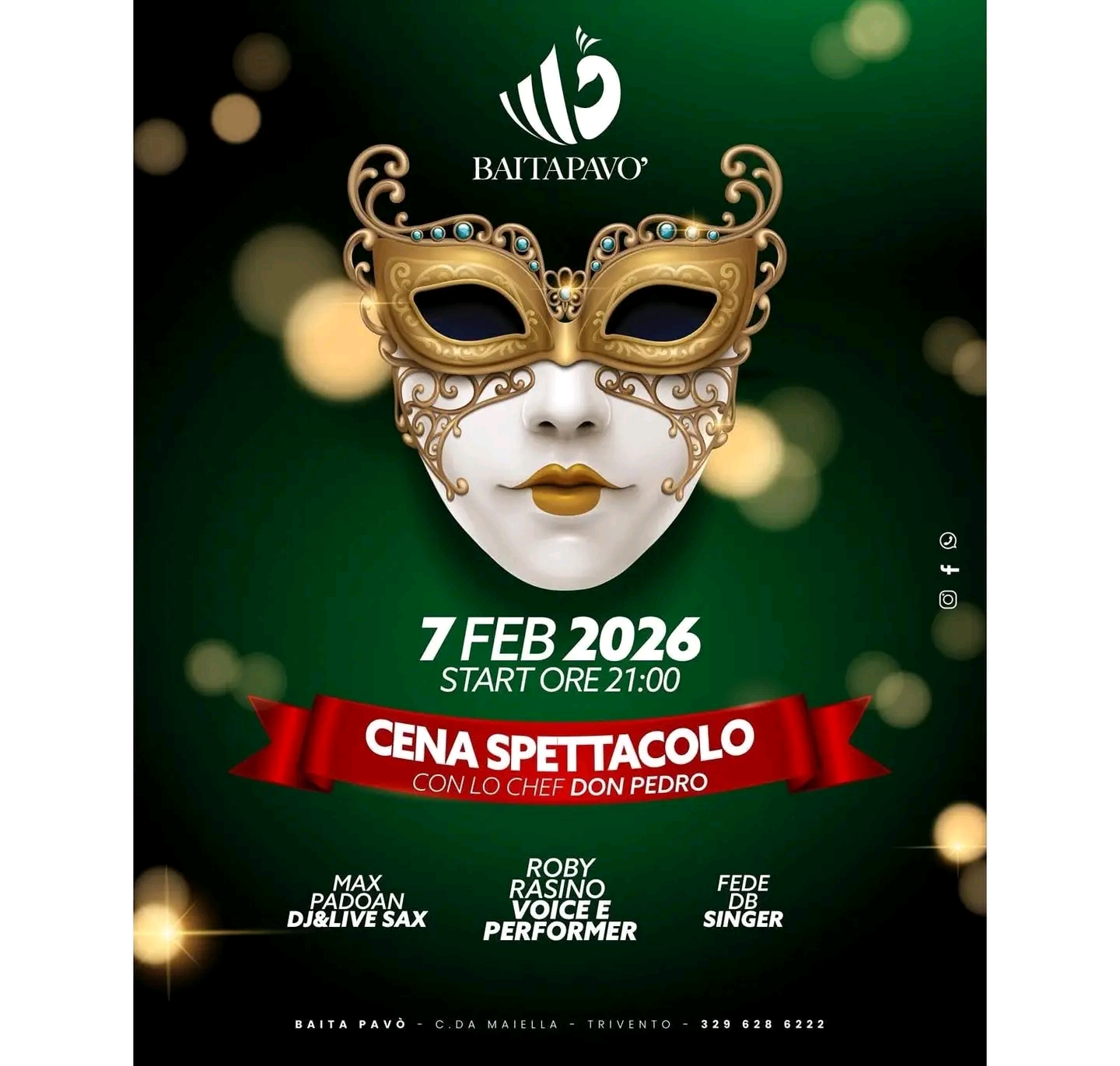 Unisciti a noi per una cena spettacolo unica il 7 Febbraio 2026, a partire dalle 21:00 presso Baita Pavò. Goditi una serata di buon cibo e spettacolo dal vivo!